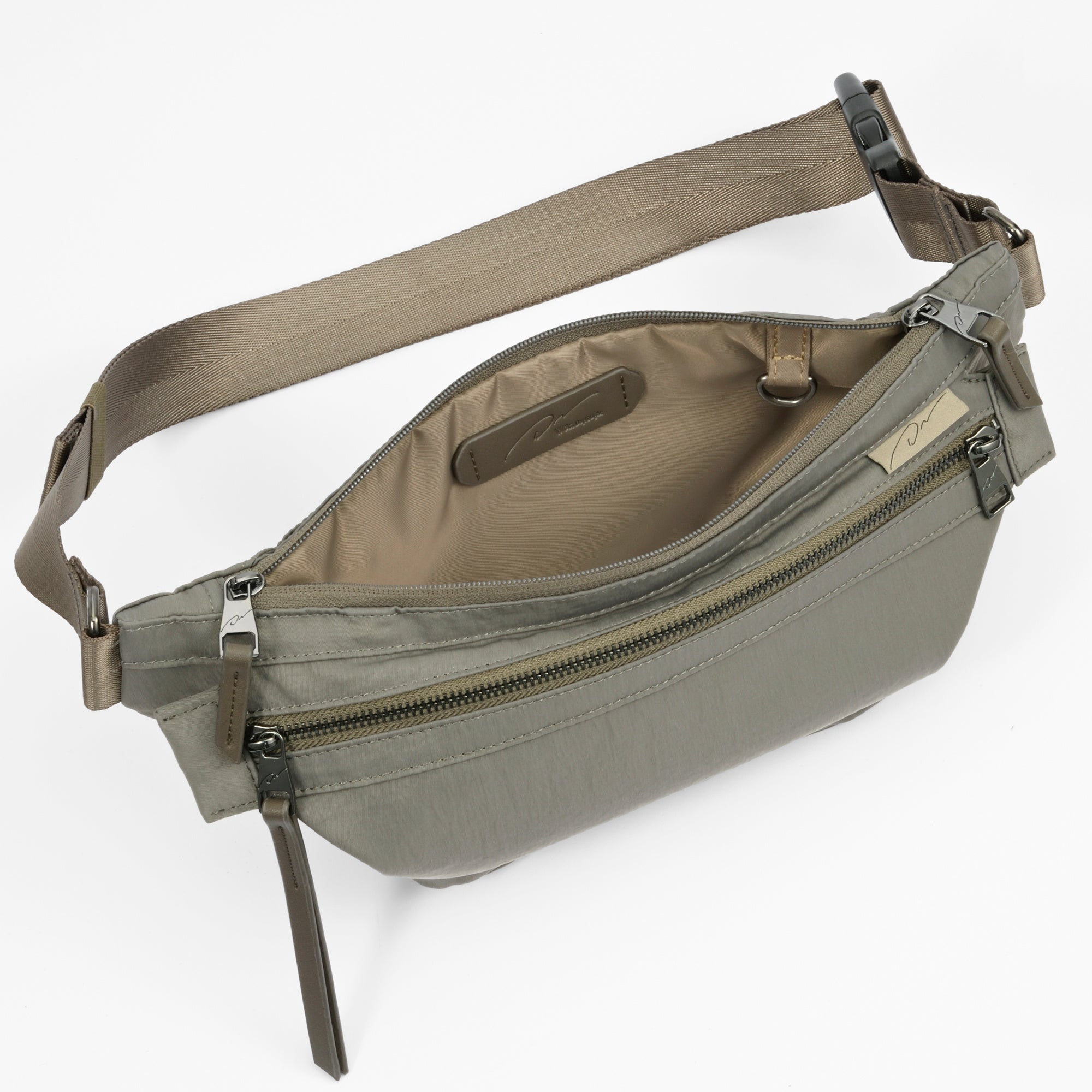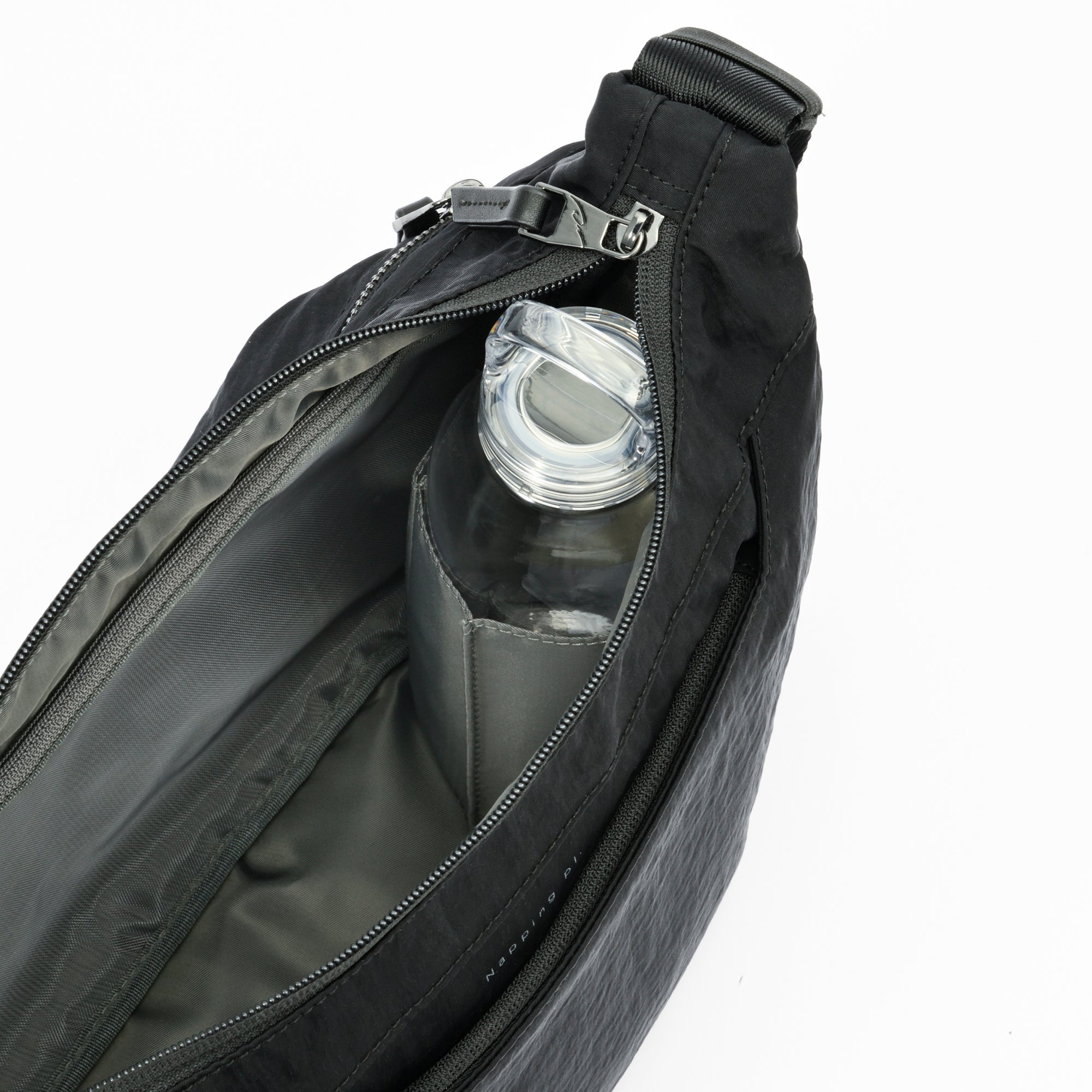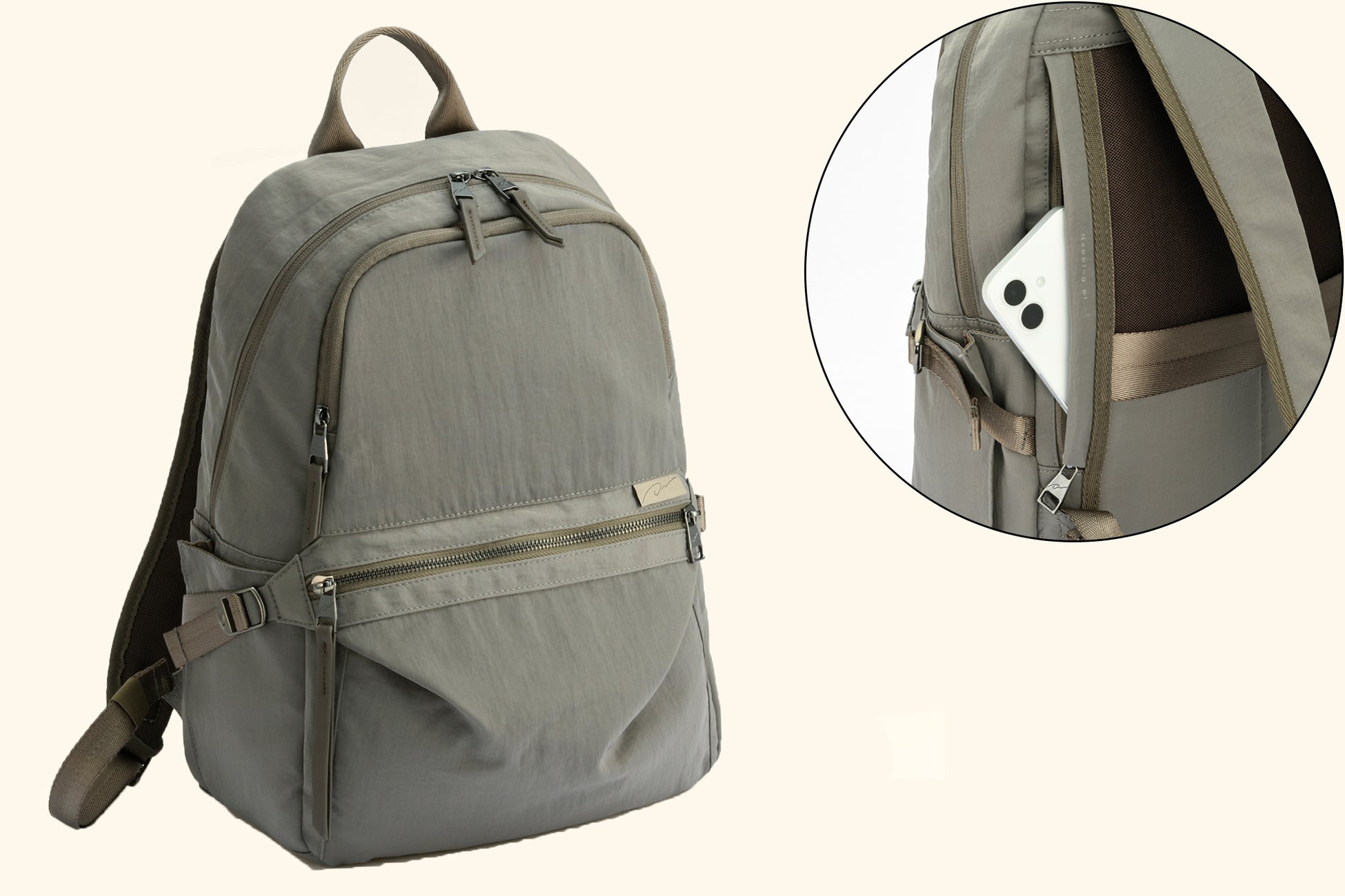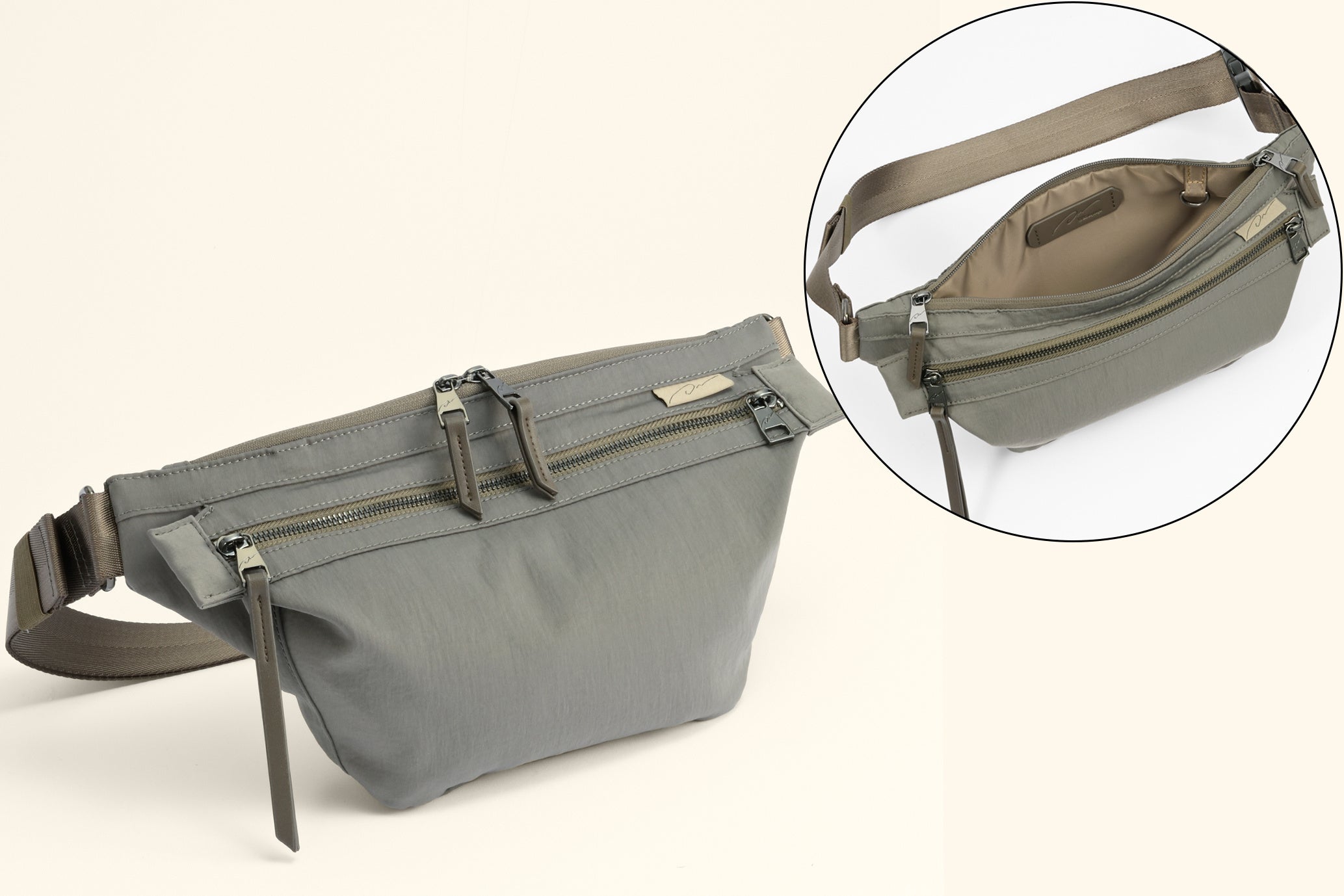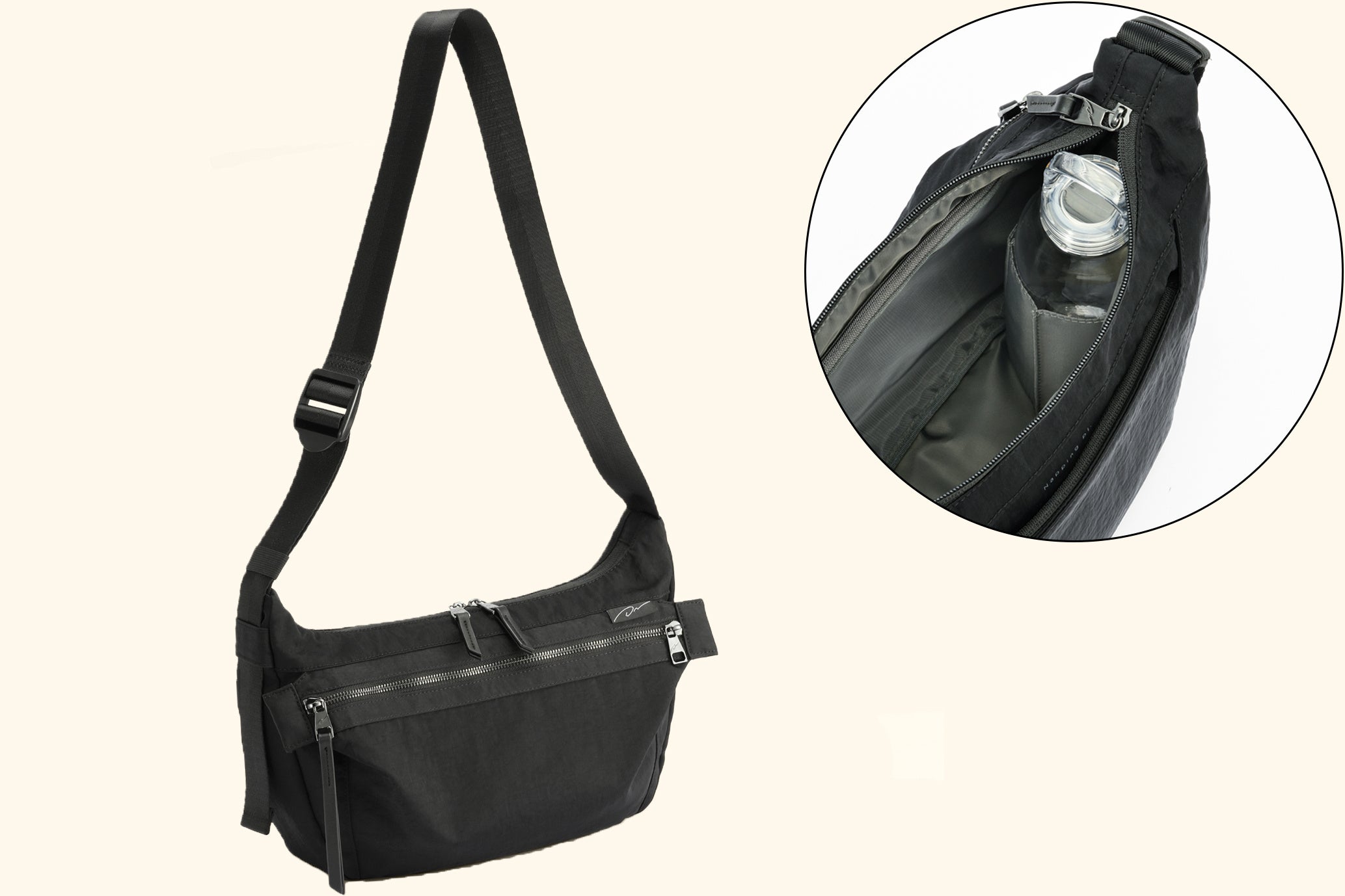 他者からは開けにくい「セキュリティポケット」を身体側に配置し、メインとフロント開口部は、左右どちらからでもアクセスしやすいファスナー仕様を採用。パスポートや航空券、ペットボトルなどが入り、旅行や出張シーンにちょうどいいサイズ感です。
