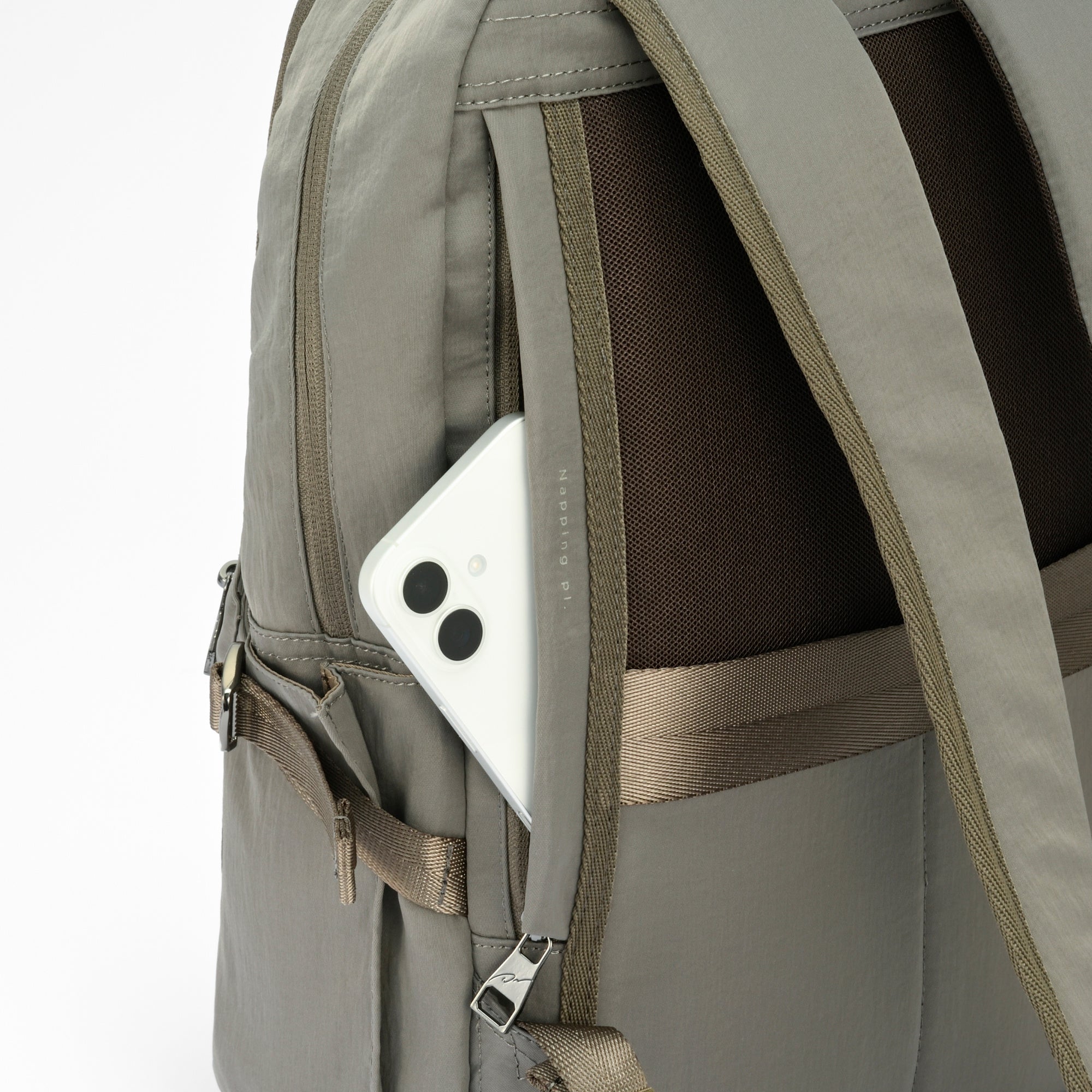 アジャスター付きで容量調節ができる「フロントポケット」をはじめ、上部に配した、小物の収納に便利な「フロントポケット」、ペットボトルを収納できる「サイドポケット」を配置。軽量設計で、出張時やオフの日にも活躍します。