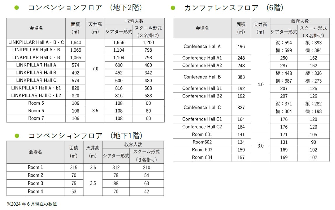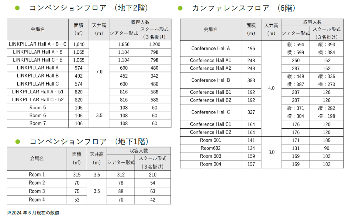 広さ約1,640㎡の分割利用が可能な多目的ホール「LINKPILLAR Hall」7室の会場、4室の控室により構成されます。国際会議や学術会議、講演会、展示会・見本市の開催など、幅広く多様なニーズに対応します。スムーズな搬出入を可能にする専用荷捌き所も魅力のひとつです。