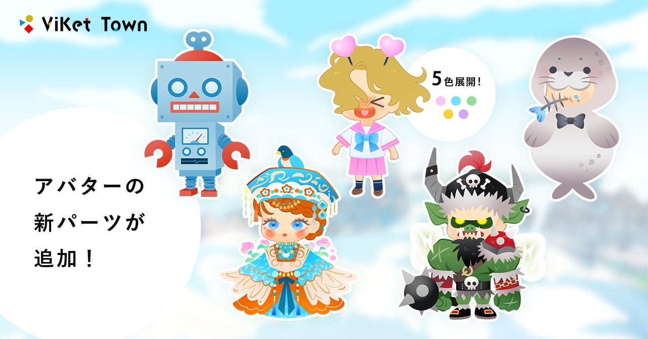 「ViKet Town(ビケットタウン)」では自分となって働くアバターが存在します。アバターには、頭、髪、目、口、服装、数種類の初期パーツから選択する事ができ、理想とする自分を生み出す事が可能です。 アバターを通してのコミュニケーションは、年齢、国籍、性別、見た目、生まれ持ったルーツによる様々な偏見をなくし、 純粋な気持ちで仲間とのプロジェクトの成功を目指す事ができます。 自分に自信がない人でも、働く新たな自分を生み出すことで、コミュニケーション能力の向上も期待でき、異空間で働くアバターは、様々なアイテムを身に着け、仲間とのコミュニケーションのきっかけともなります。今回は、5月に合わせた爽やかな色合いのコスチュームや、グループで使いやすいカラーチェンジ可能な衣装など、これからの季節が楽しくなりそうな新作が登場!