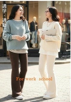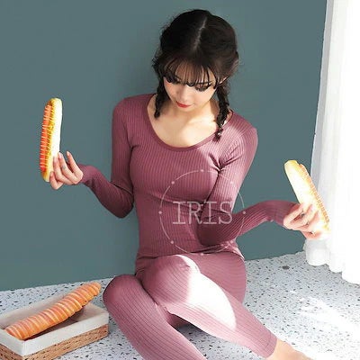 リブ編みの透けない生地で1枚でも着用可能な12分袖トップスと、足首まで暖かい10分丈レギンスのセット。伸縮性も高く快適に。
