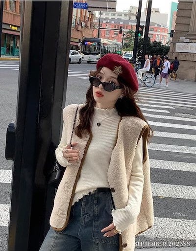 シャギーの裏起毛で暖かさ抜群なのに、リブ編みのハイゲージニットですっきり見え。トレンドライクな“もこもこベスト”と合わせて寒さ知らずに。