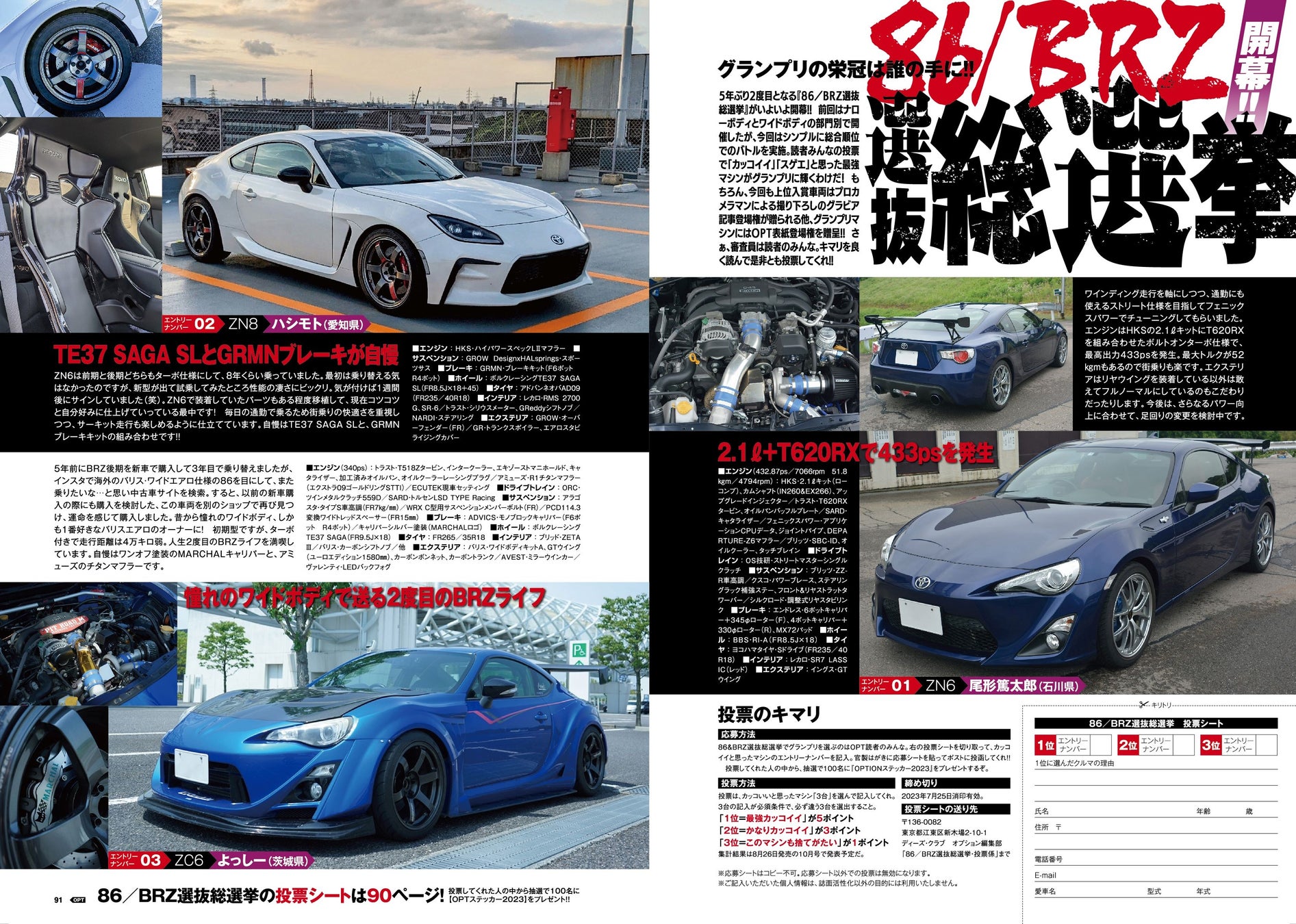 オプション名物企画『選抜総選挙シリーズ』の第5弾は、86/BRZだ。2世代4車種での激戦となるが、OPT表紙登場権を賭けたスーパーチューンドのスペックはオーナーならずとも必見の価値あり。読者みんなの投票を待っているぞ!