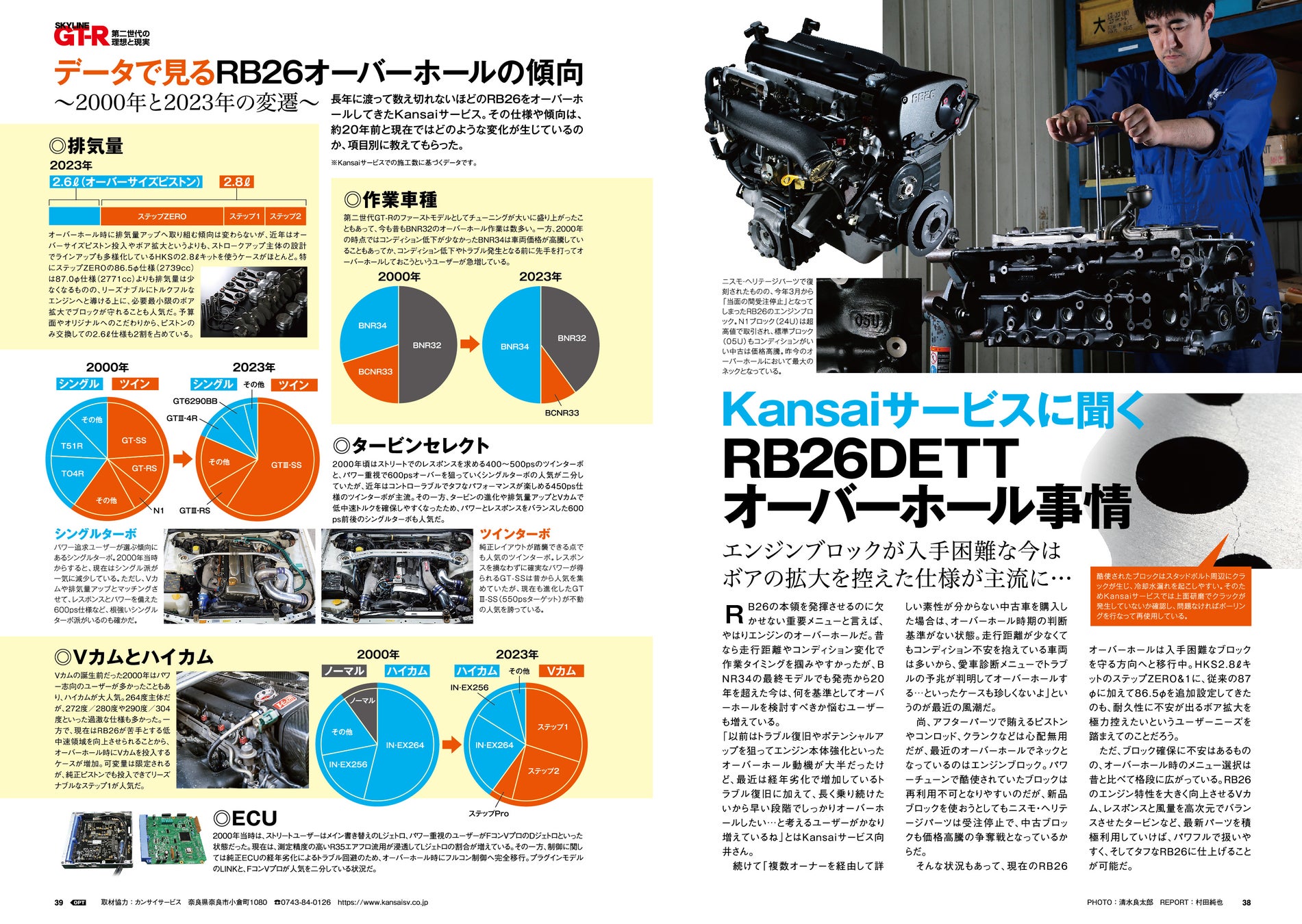 車両価格が高騰し、かつてのようにモアパワーのニーズだけではなくなってきた、RB26エンジン本体のチューニング。Kansaiサービスが誇る各種データを参考に、2000年と2023年のユーザーニーズを見比べながら、最新のオーバーホール事情に迫る。