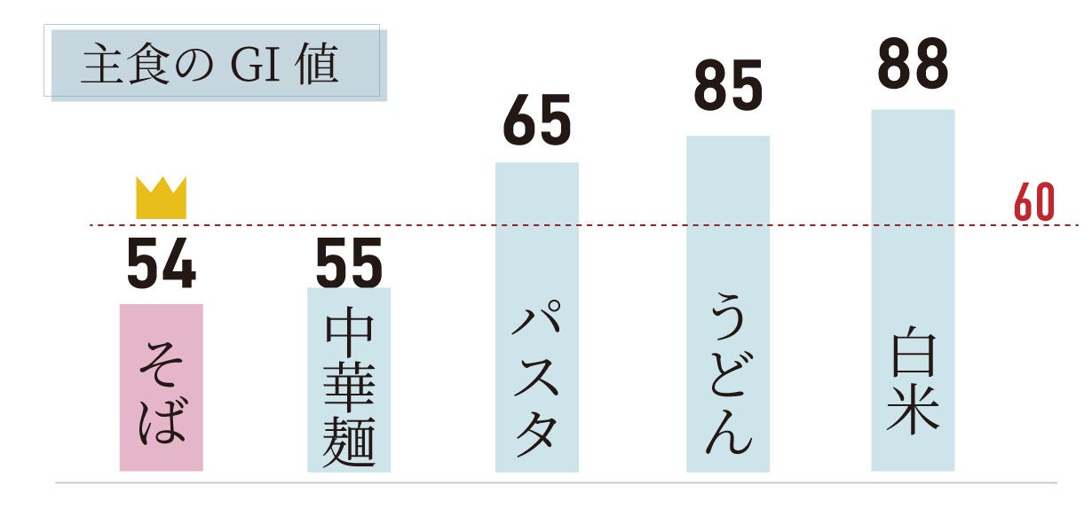 ●GI 値の高い食品は肥満の原因とも言われています。60 を超える食品は避け、GI 値の低い食材を選ぶのが良いとされています。白米の84に比べ、そばは54と、ダイエットにも向いています。