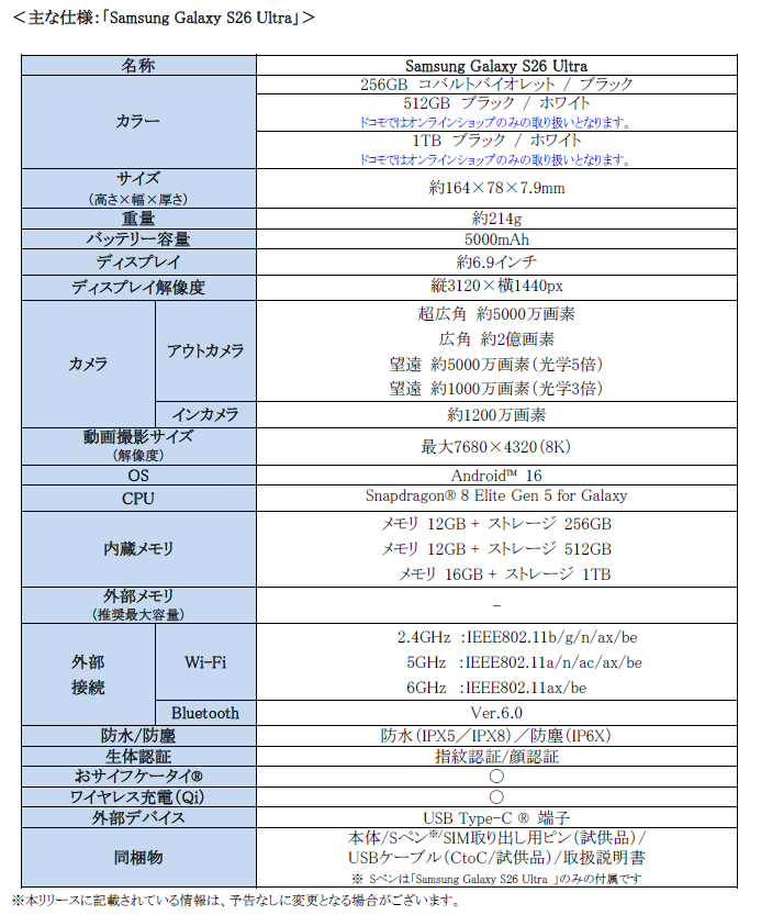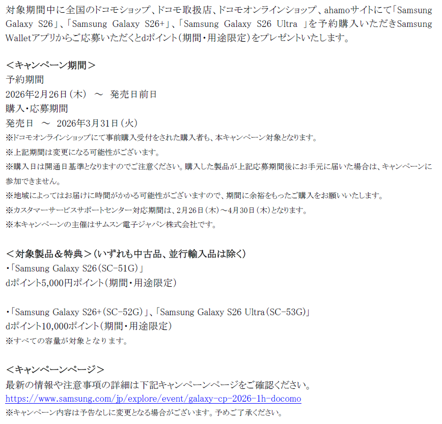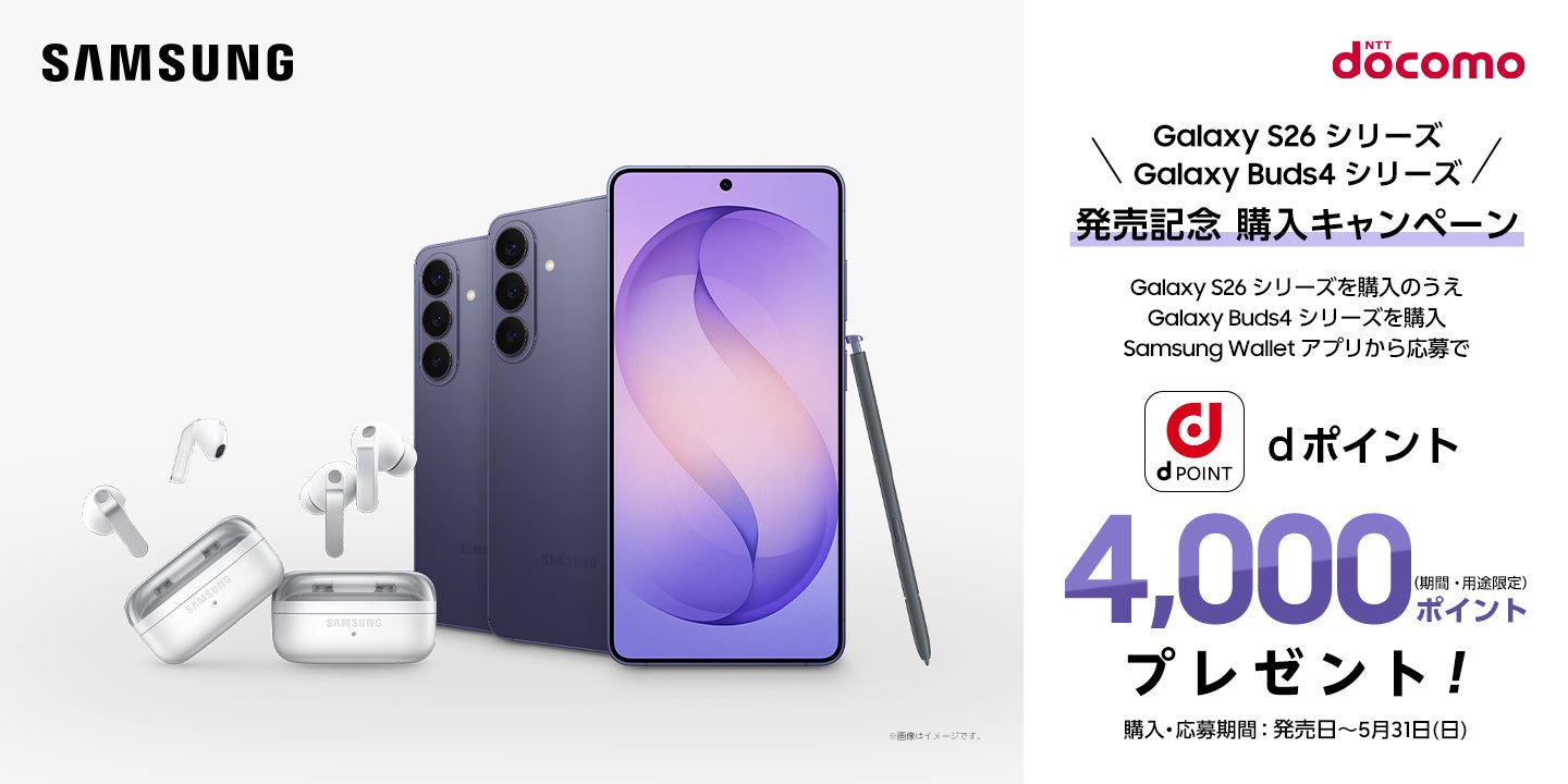 サムスン電子ジャパン株式会社(以下、サムスン)は本日、パワフルなハードウェアと業界をリードするカメラ性能、進化した直感的なGalaxy AI※が日常をかつてないほど快適で簡単にしてくれる先回りするAIフォン「Samsung Galaxy S26」、「Samsung Galaxy S26+」、「Samsung Galaxy S26 Ultra 」(以下、「Samsung Galaxy S26シリーズ」)を株式会社NTTドコモ(以下、ドコモ)で発売を決定いたしましたのでお知らせいたします。「Samsung Galaxy S26シリーズ」は全国のドコモショップ、ドコモ取扱店、ドコモオンラインショップ、ahamoサイトにて2026年2月26日(木)より予約受付を開始し、2026年3月12日(木)より販売開始予定です。