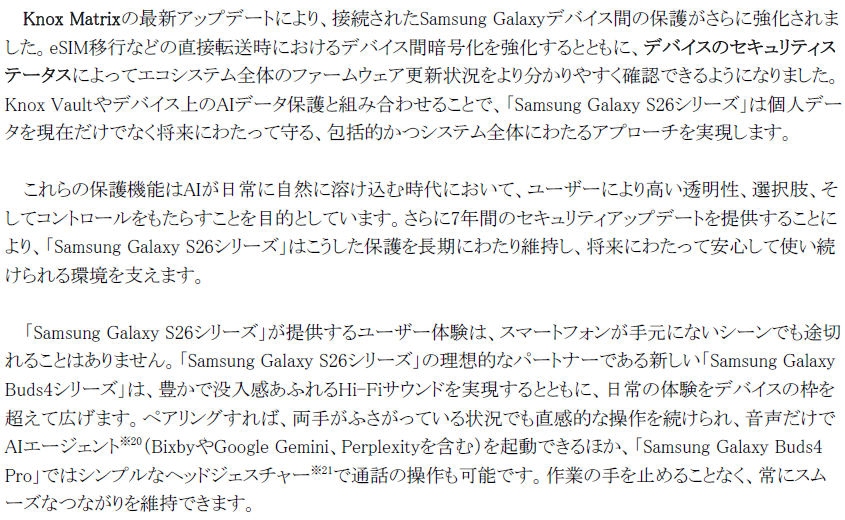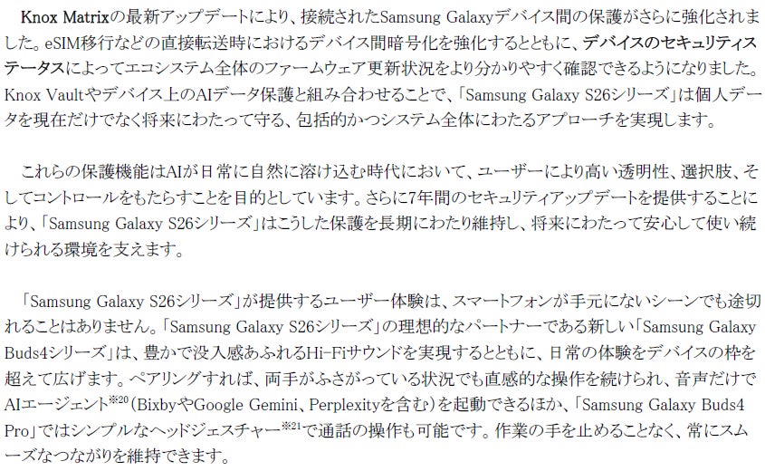 こうした卓越した技術の融合により、「Samsung Galaxy S26シリーズ」はかつてないほど快適でパワフルなSamsung Galaxy体験を提供します。