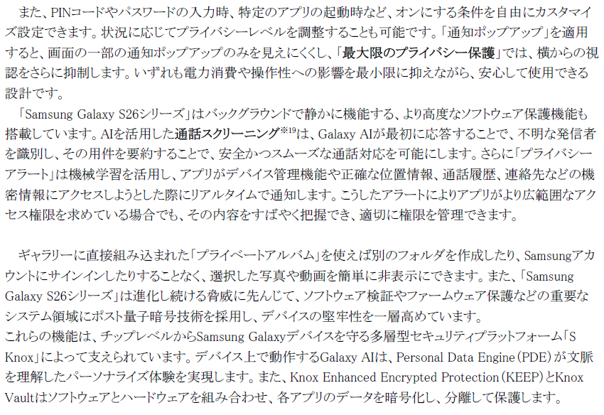 「Samsung Galaxy S26シリーズ」は、Samsungの誇る最先端の技術を結集し、比類なきパフォーマンス、最高峰のカメラシステムそして直感的なGalaxy AIが一体となって機能するよう設計されました。この盤石な基盤により、「Samsung Galaxy S26シリーズ」に搭載された高度な機能は一日中快適に利用可能で、且つユーザーはセキュリティやプライバシーを損なうことなく、安心してデバイスを使用することができます。