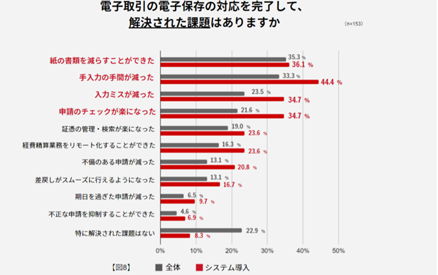 以上の結果から、電子取引の電子保存への対応は業務効率化につながることがわかります。なかでも、システム導入企業の回答がいずれも高い結果を示しており、システム導入を行うことでさらに業務効率化が進むことが判明しました。