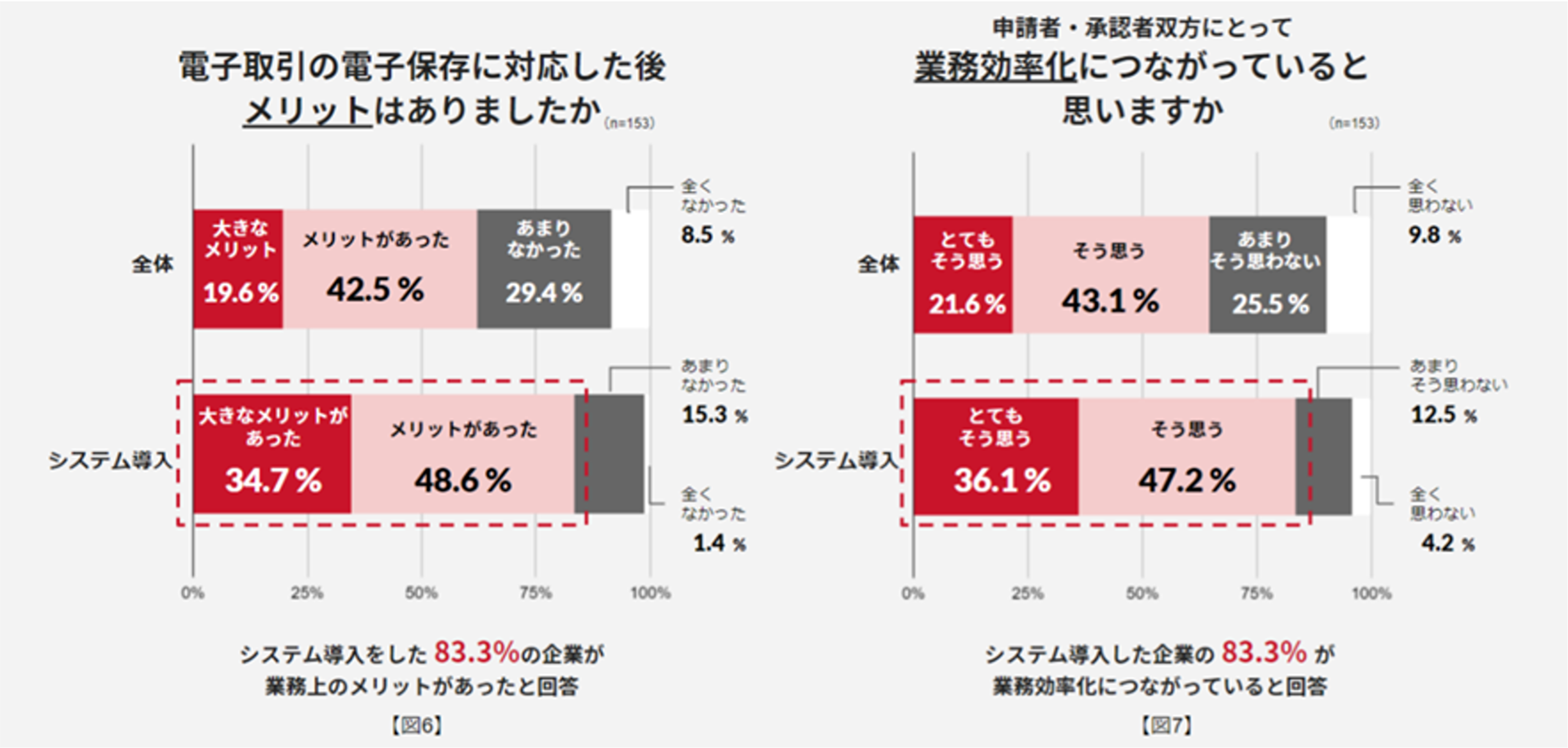 一方、図7で示した通り、申請者・承認者にとっての業務効率化については、全体で64.7%の担当者が業務効率化につながっていると回答。システム導入をしている企業では83.3%の担当者が同様に感じています。