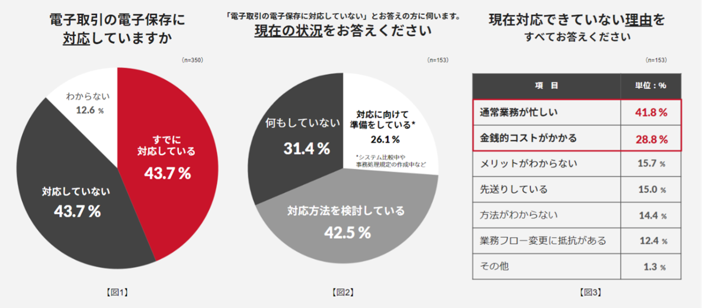 ◆改正電帳法における電子取引の電子保存に対応できている企業は43.7%(図1)。未対応企業のうち、準備に着手できていない企業が73.9%(図2)。対応できていない主な要因は通常業務の多忙・金銭コスト(図3)。