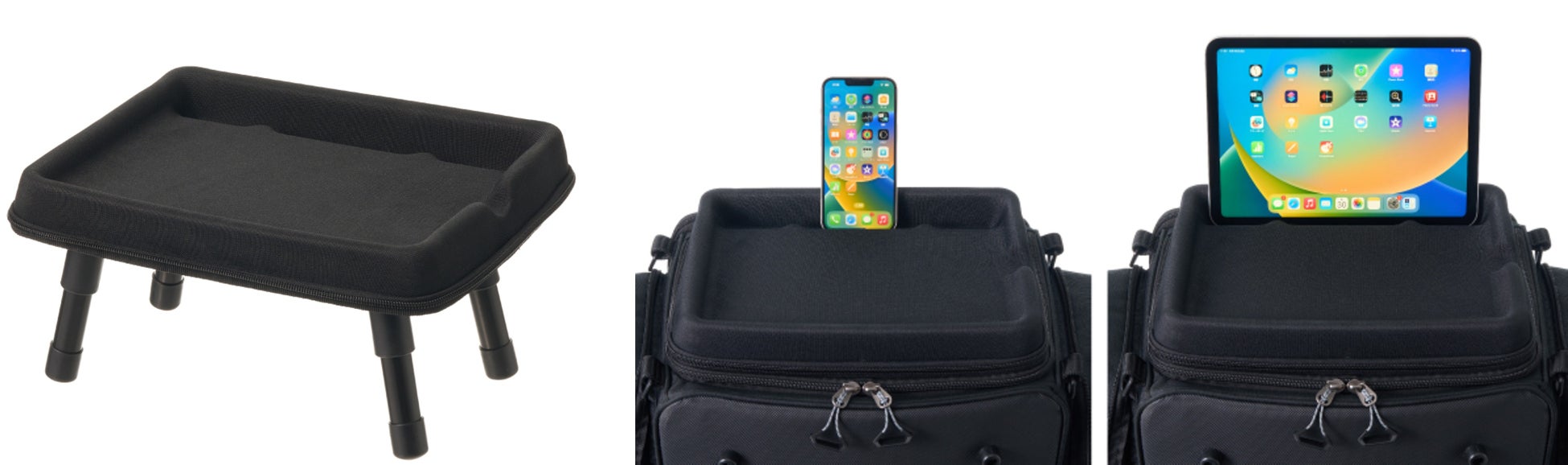 リュックから取り外して使えるテーブルには、置いたものが転がり落ちないトレー型の天板を採用しています。天板の溝にスマホやタブレットを固定することも可能で、テントの中で動画を見たり、撮影や動画配信する際にも便利です。