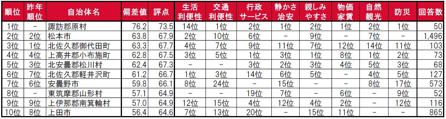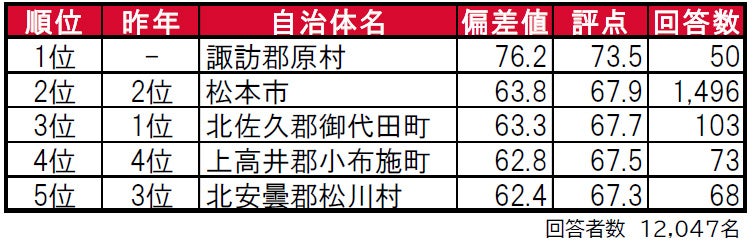 昨年は回答者数が50名未満だったため集計対象外だった原村で今年初登場で1位です。車もしくは電車の利用で東京まで約2時間半、名古屋まで約3時間でアクセスできる立地の良さを活かし、行政と住民が一体となって移住者への積極的な支援を行う「長野県移住モデル地区」に指定されており、唯一偏差値70台の高い評価を得ています。