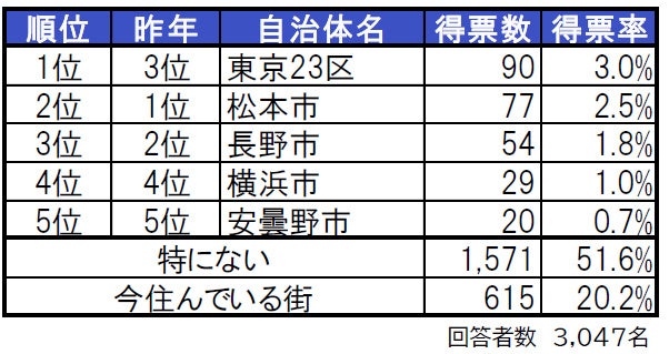 住みたい街は、1位東京23区、2位松本市、3位長野市。