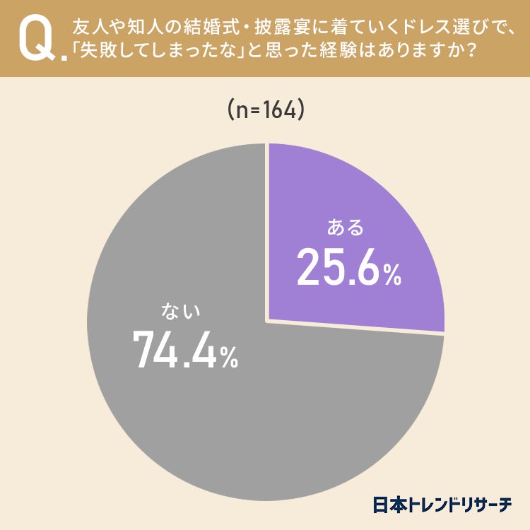25.6%の方が、友人や知人の結婚式・披露宴に着ていくドレス選びで「失敗してしまったことがある」と回答しています。
