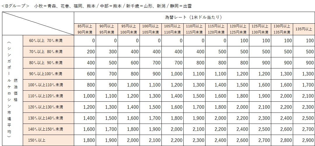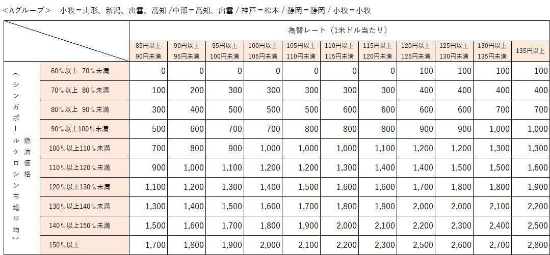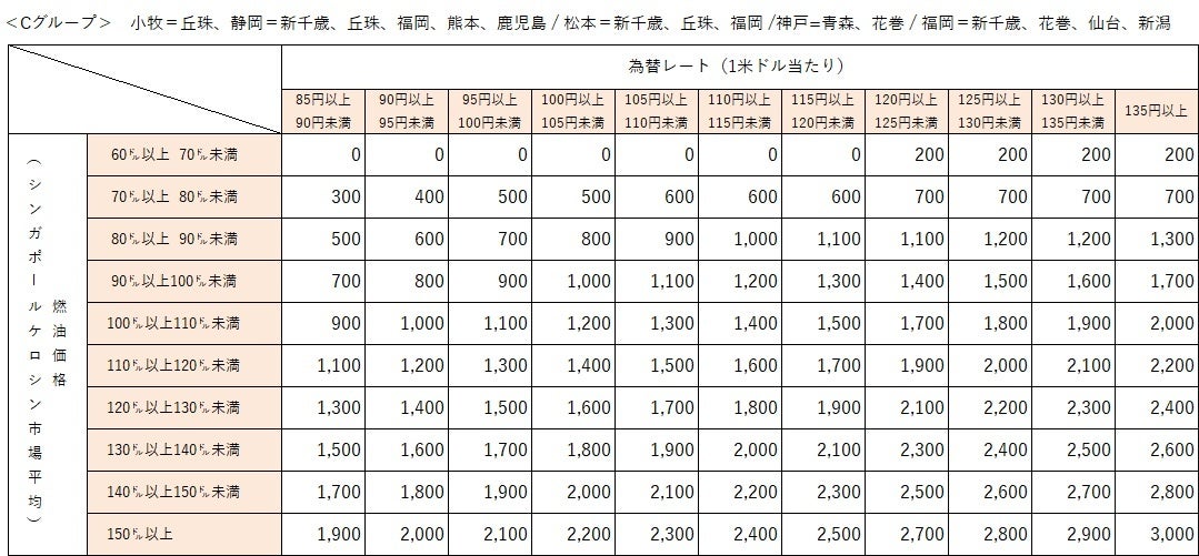 なお、燃油特別付加運賃は、シンガポールケロシン市況価格および為替レートの変動に応じて、 1ヶ月毎に見直しております。