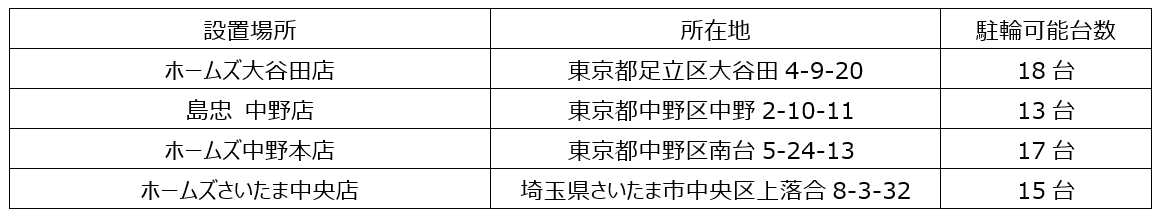 シェアサイクル「HELLO CYCLING」ステーションの設置は、東京都および埼玉県に展開する島忠・ホームズ4店舗より開始しました。シェアサイクルという新たな来店・移動手段が加わることで、より多くのお客さまのご来店を期待できるほか、地域住民の皆さまの移動の利便性向上も企図しています。