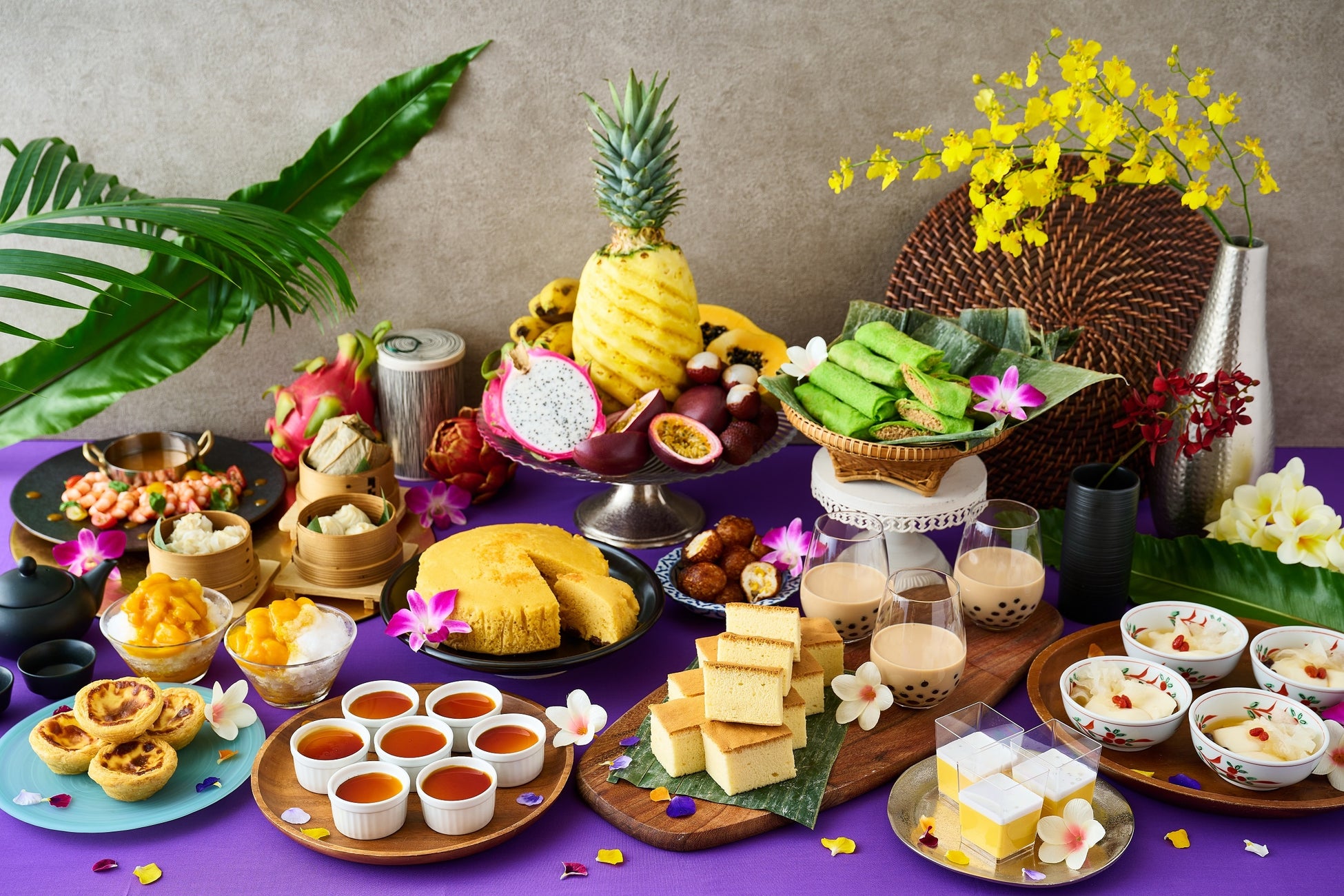 また、ふわふわな生地と軽やかな口あたりの台湾カステラが出来たてメニューで登場するほか、マンゴープリン、エッグタルトなどアジアンスイーツの定番メニューや、ドラゴンフルーツ、パパイヤ、ライチなどのトロピカルフルーツ、タピオカドリンクなどもお好きなだけお召し上がりいただけます。