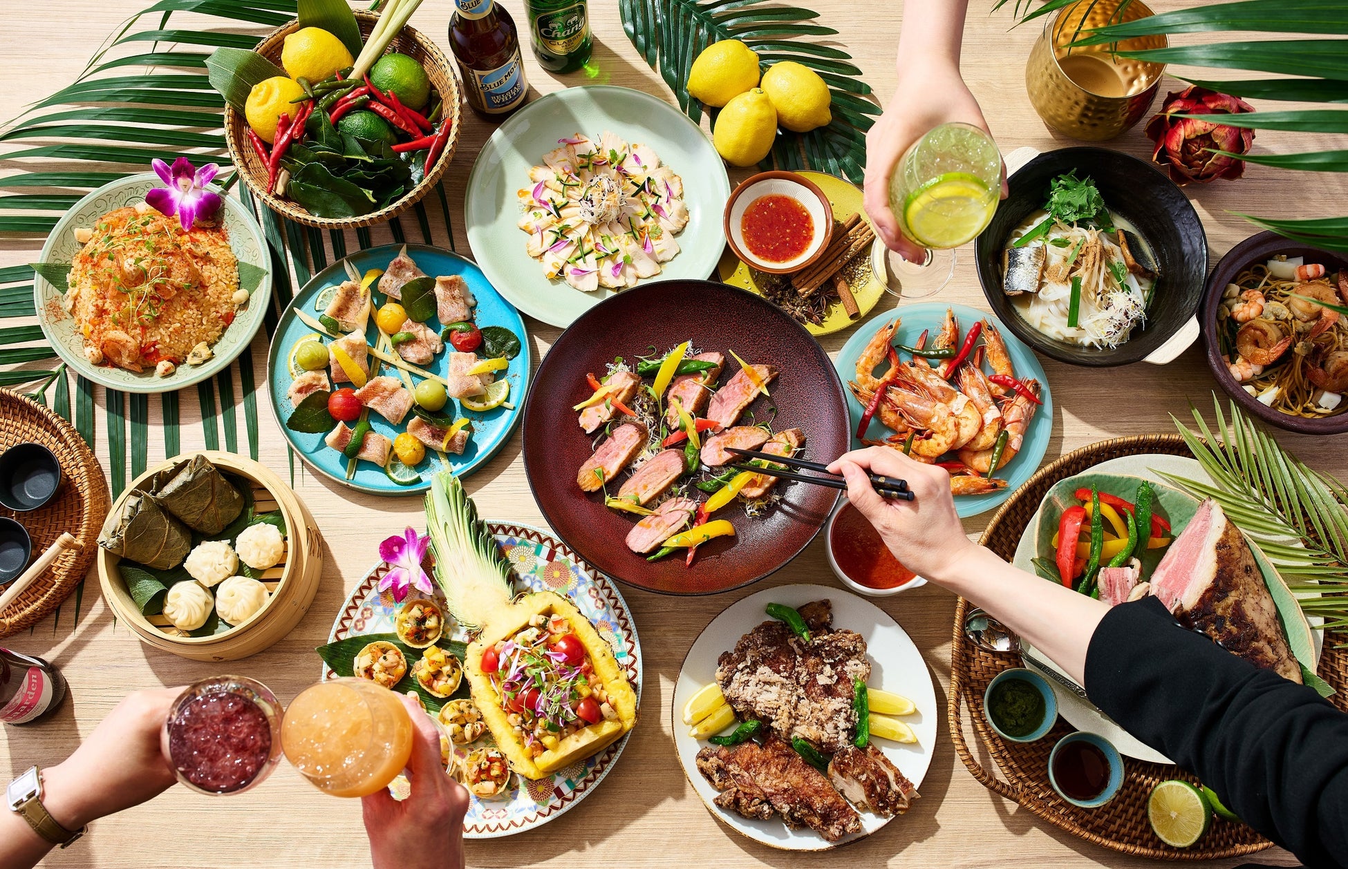 南国フルーツを使ったカクテル5種や、タイの「シンハー」、シンガポールの「タイガー」などアジアのビールもお好きなだけお愉しみいただけるフリードリンクオプションは、ご友人やお仲間との夏のお集まりにぴったり。