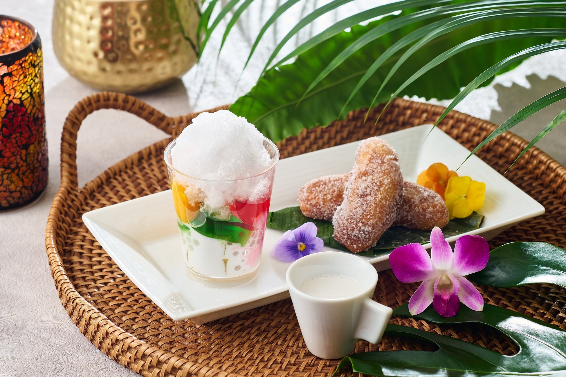 シェフの一皿は、暑い季節に食べたくなる、かき氷に似たベトナムの伝統的なひんやりスイーツ「チェ―」と、南国フルーツ・バナナを揚げた、インドネシアやマレーシアなどで人気のあったかスイーツ「ピサン・ゴレン」。小学生以上のお客様へ一人一皿ご提供いたします。