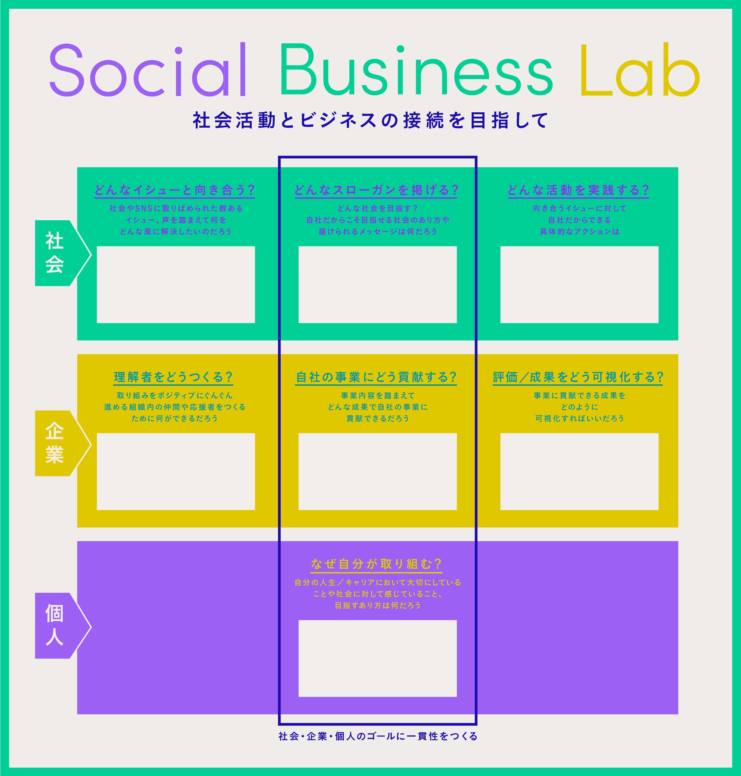 - 企業の垣根も肩書きもルールも超えて、これからのアクションやカルチャー、そしてビジネスを探り、実践していく。それがSocial Business Labです。