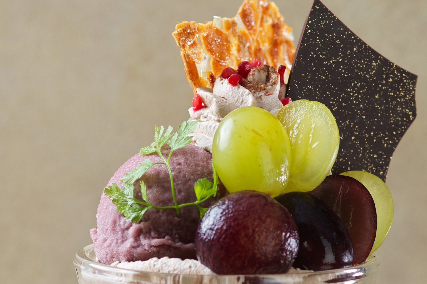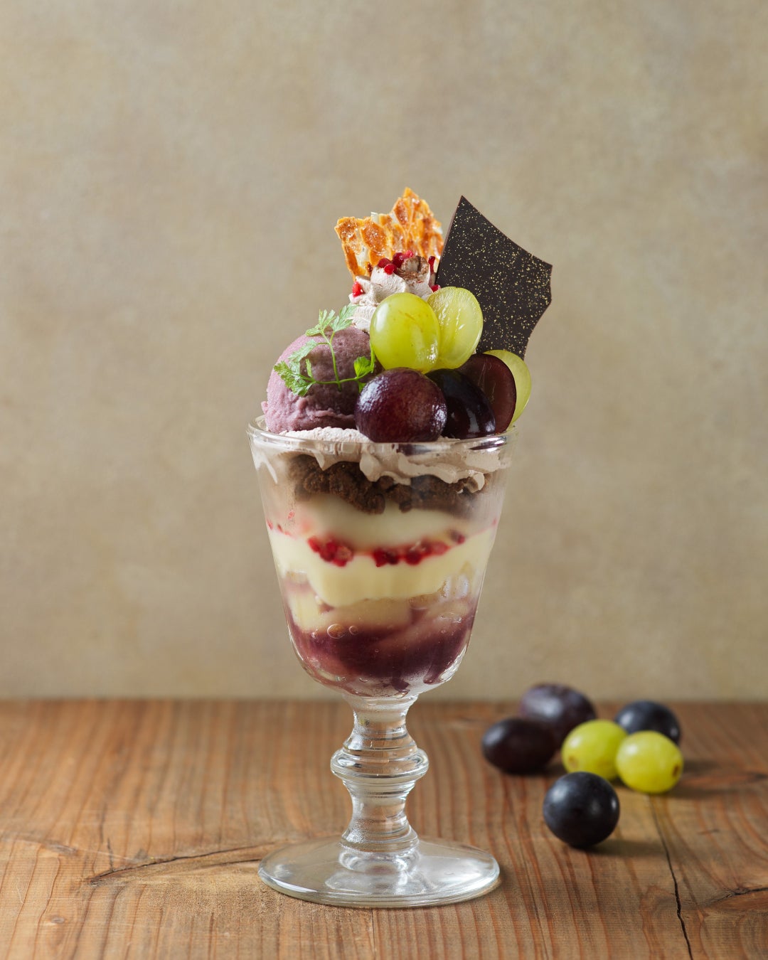 葡萄をメインに、洋梨のソルベや果肉とジュレを合わせ、さっぱりとした味わいに仕上げた秋限定パルフェです。