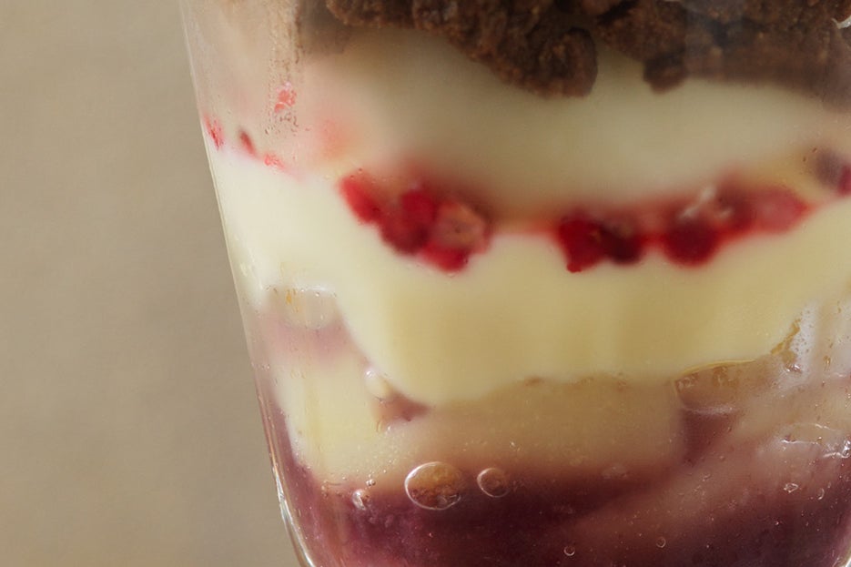 さわやかな酸味のある巨峰ソースを土台に、さっぱりとした味わいの洋梨の果肉とジュレ、コクのあるカスタードクリームを重ねました。食感のアクセントにココアシュトロイゼルをトッピング。