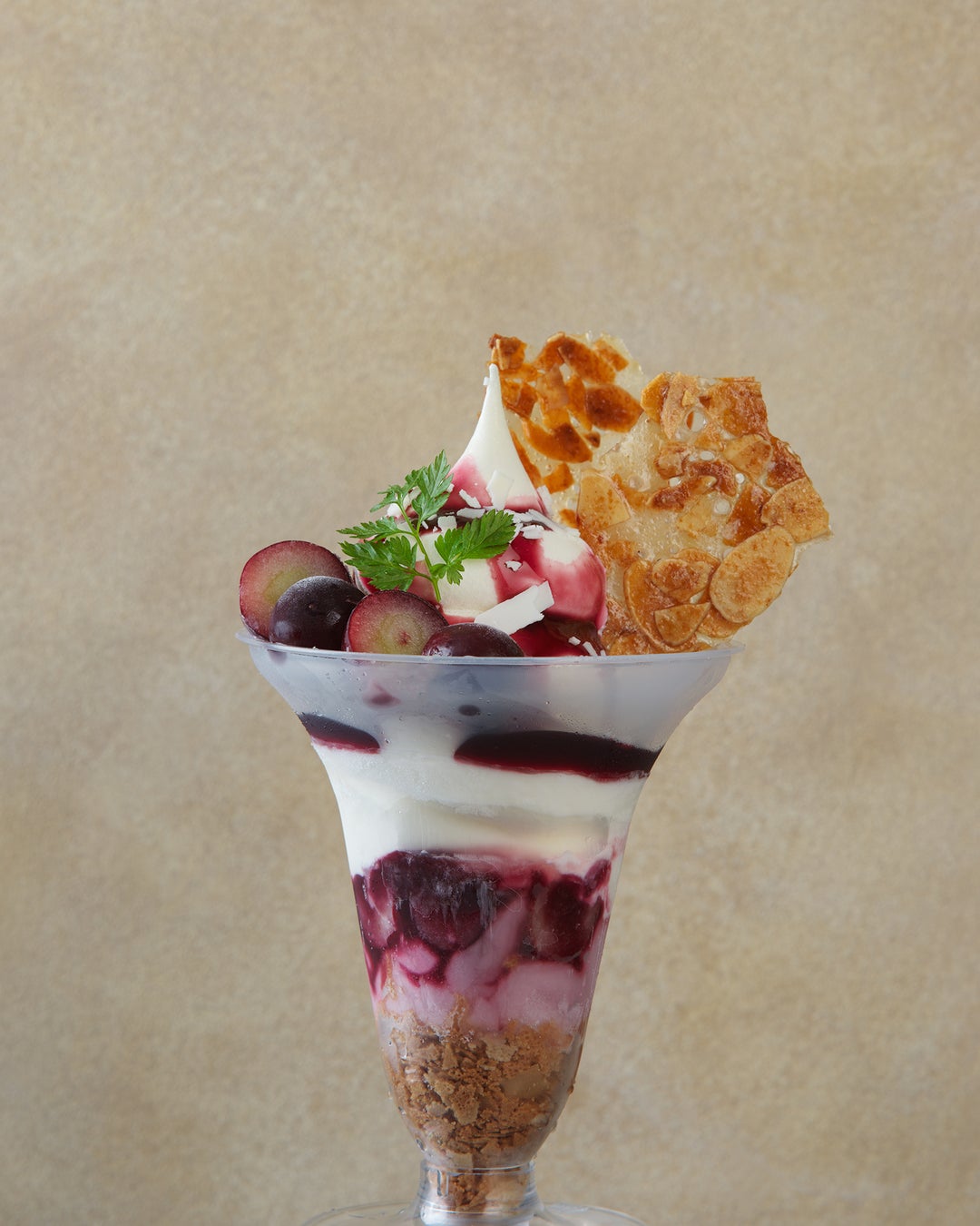 サクサク食感のフィアンティーヌを敷き詰め、さわやかな酸味のある赤葡萄のゼリーと葡萄ソース、果肉を重ね、濃厚な味わいのジャージーミルクアイスを絞りました。