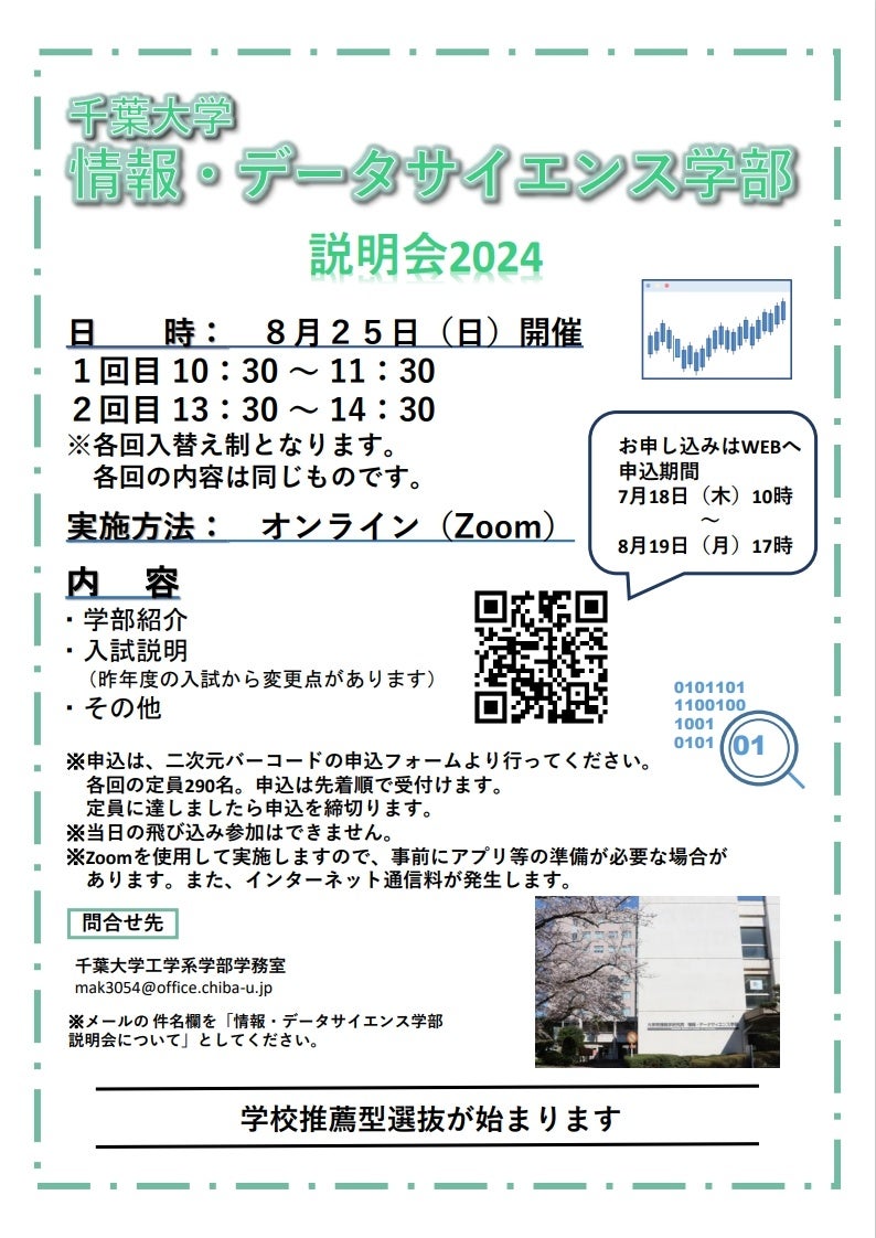詳細や参加申し込み方法等は、千葉大学情報・データサイエンス学部HP(https://informatics.chiba-u.jp) をご覧ください。