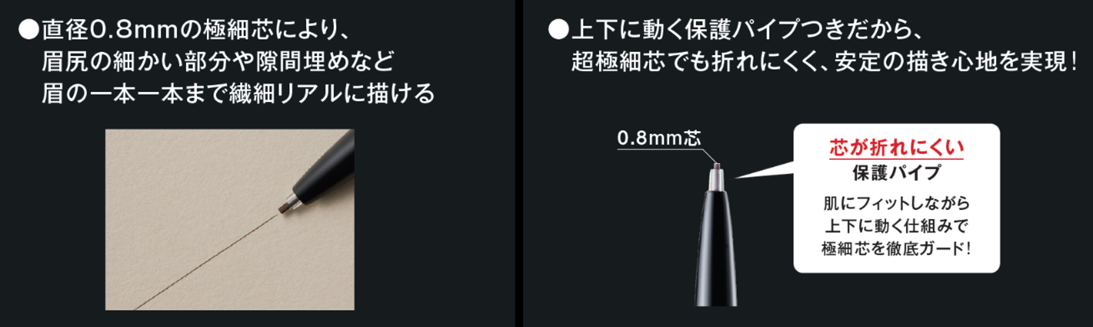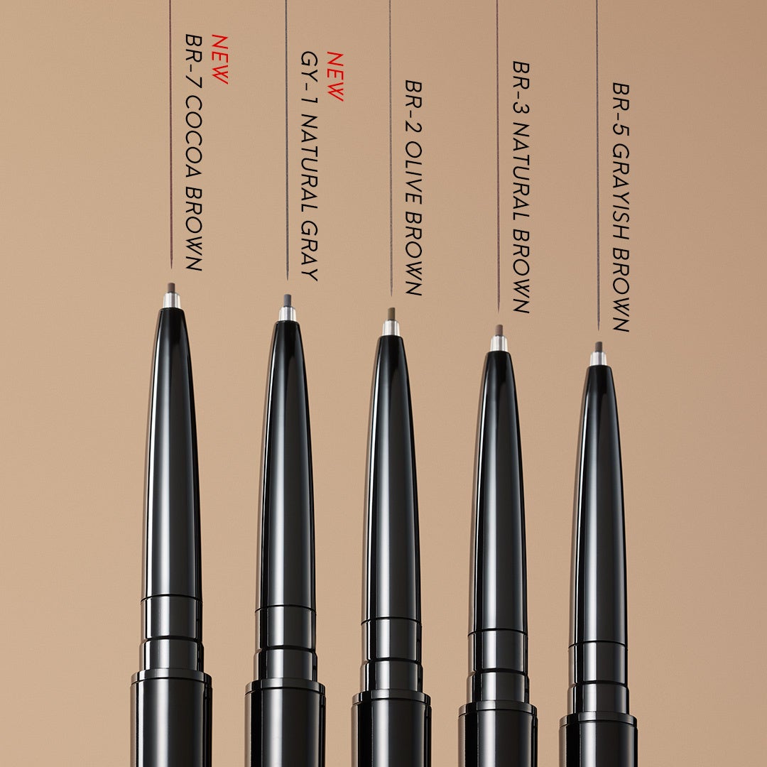 まるでシャーペンで描くようなリアルな毛流れ眉が完成。折れにくい0.8㎜の超極細芯“眉シャーペン”から、使いやすいダーク系の新色登場。