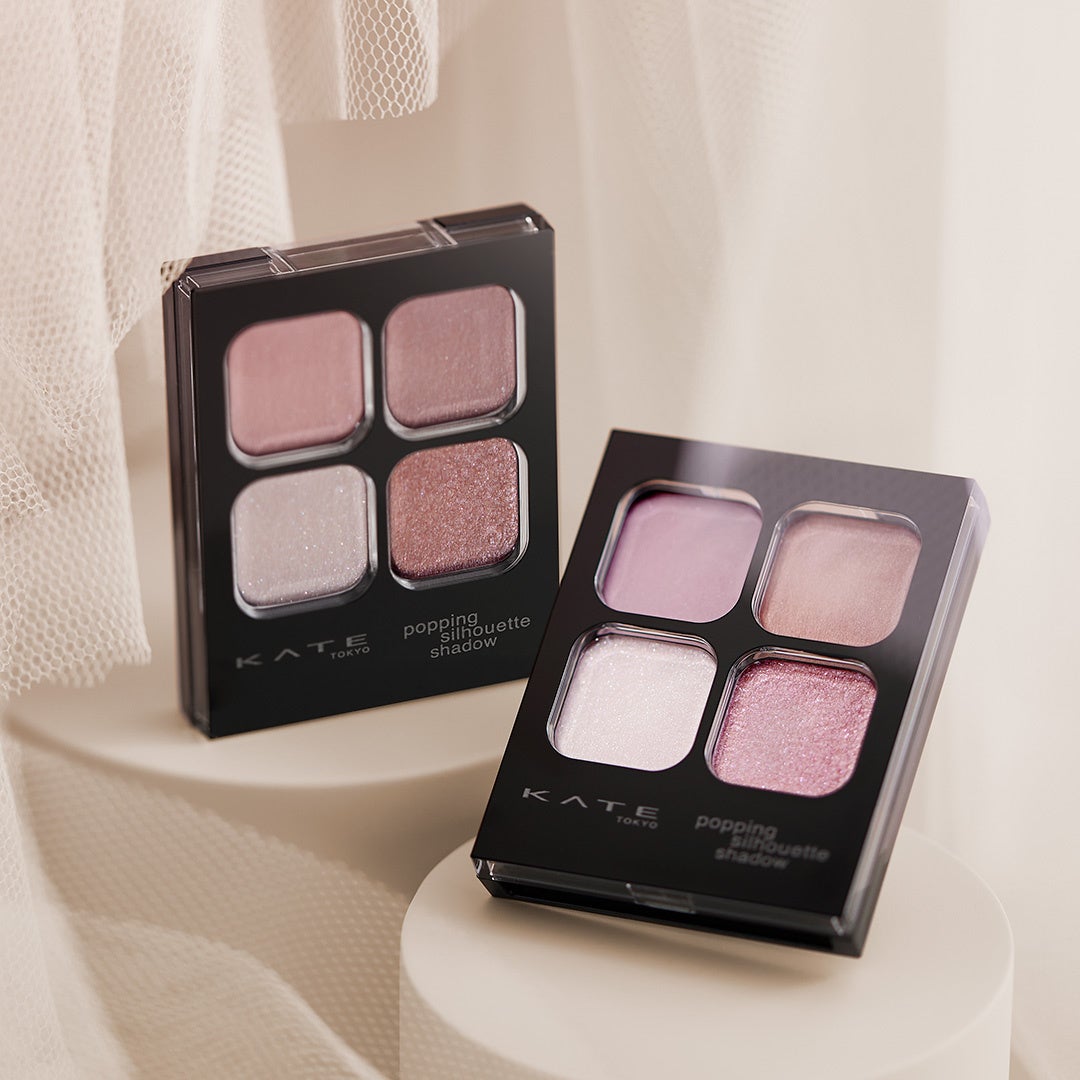 さらに、正反対の2つの質感コントラストでクリッと丸い目もと印象に仕上がる「ポッピングシルエットシャドウ」からは、淡いのに盛れるピンクグレージュカラーの限定色を数量限定で同日発売いたします。