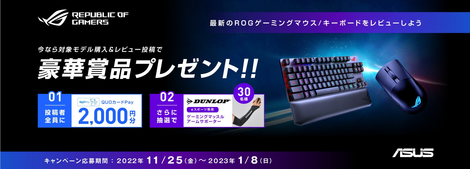 ASUS JAPAN株式会社は、ASUSのゲーミングブランドRepublic Of Gamersの最新ゲーミングマウスまたはキーボードを購入して参加できる「ROG最新ゲーミングマウス&キーボードレビューキャンペーン」の開催を発表しました。