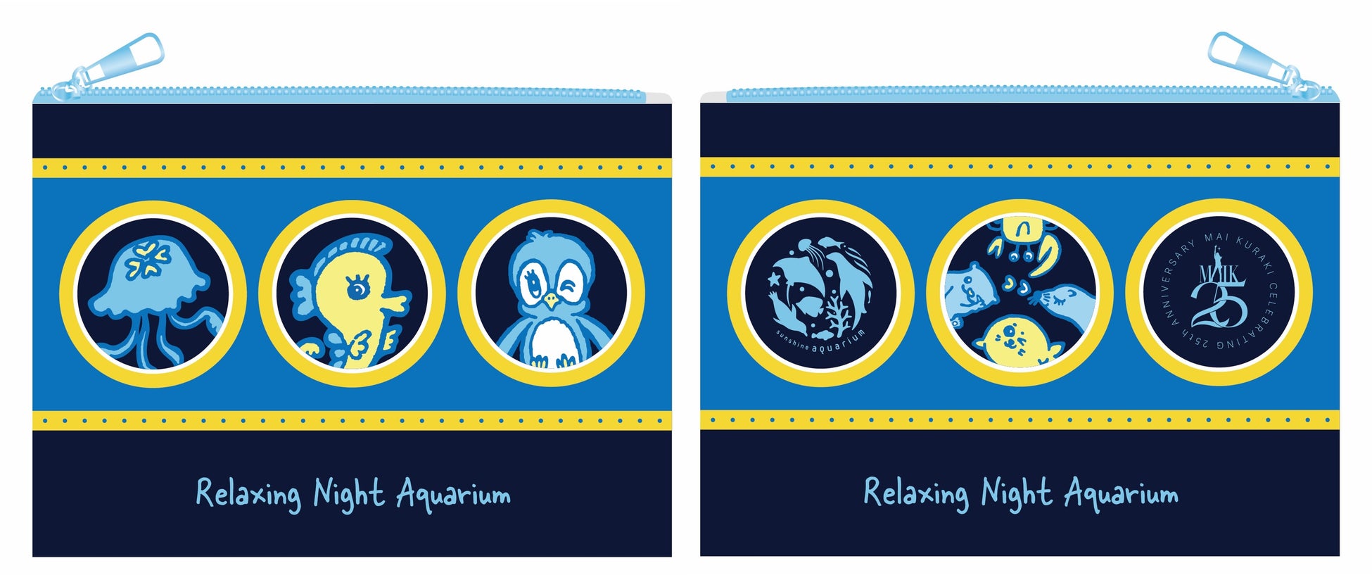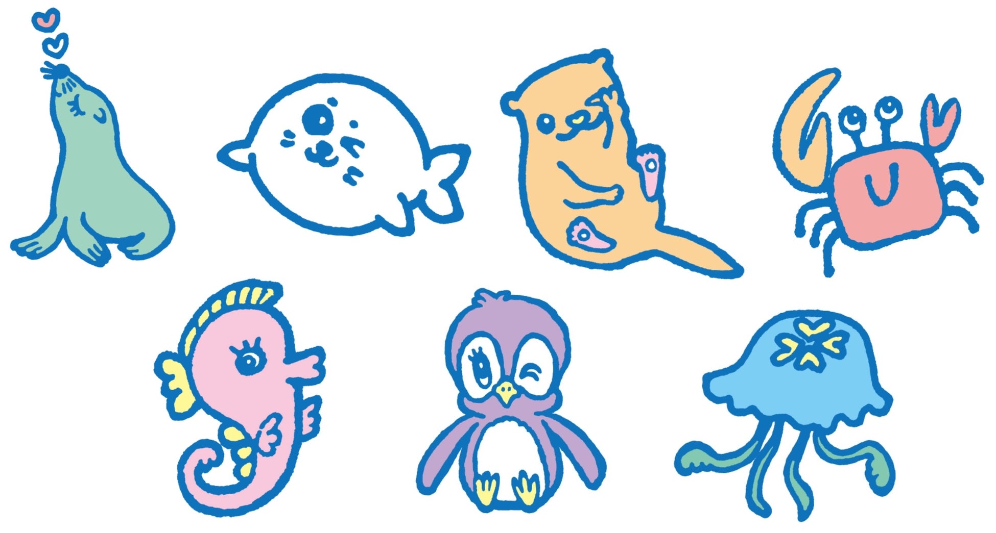 サンシャイン水族館の大好きな海の生き物たちにありがとうという気持ちと、これからも元気でいてほしいという気持ちで、楽しく愛しく描かせていただきました。キャラクターの中にハートが紛れています。探してみてください♡