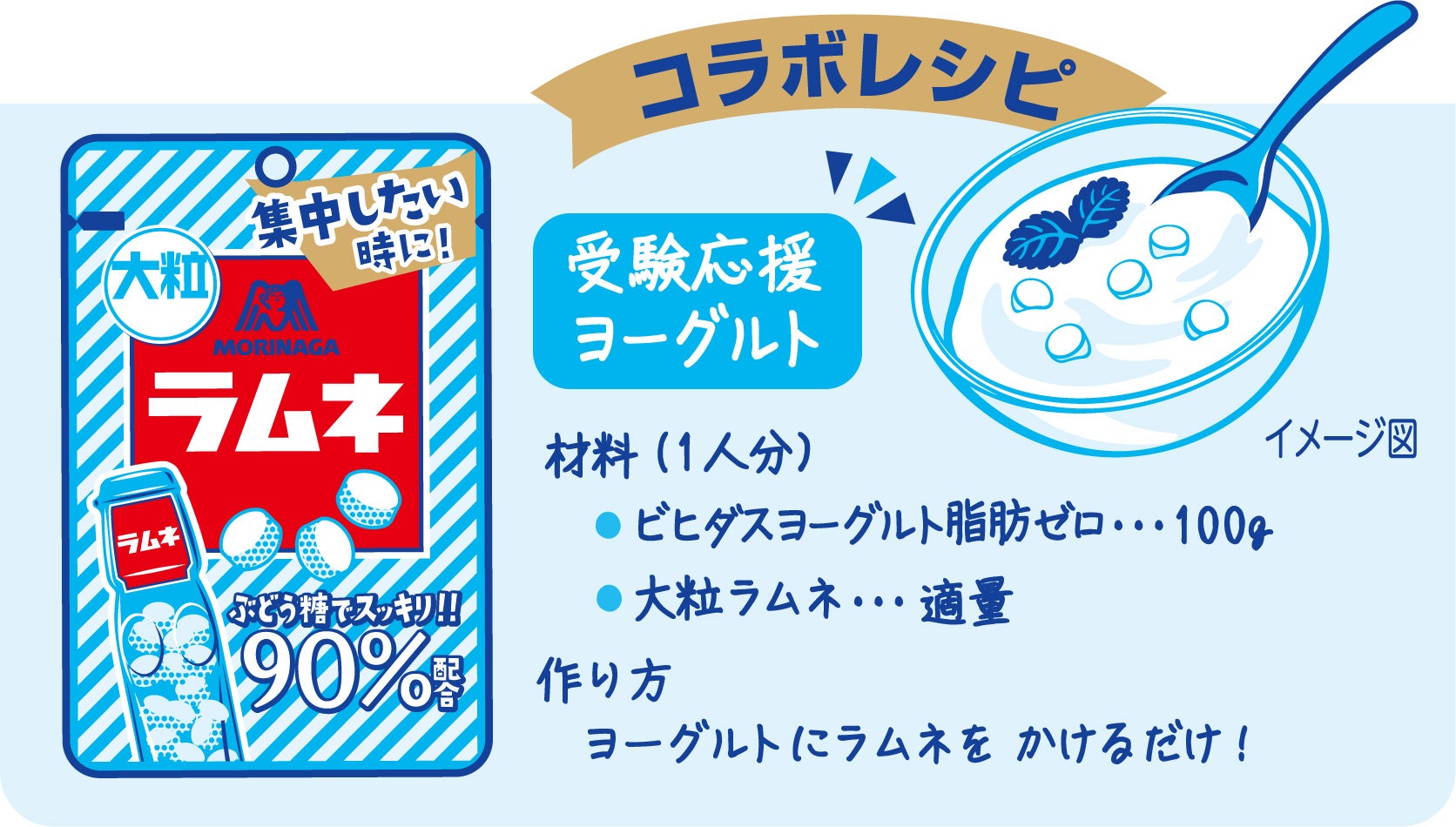 「大粒ラムネ」裏面と、「ビヒダスプレーンヨーグルト脂肪ゼロ」「ビヒダスプレーンヨーグルト加糖」裏面および側面に、ラムネとヨーグルトを使用した “受験応援ヨーグルト”レシピを掲載します。※「ビヒダス プレーンヨーグルト」への掲載はありません。