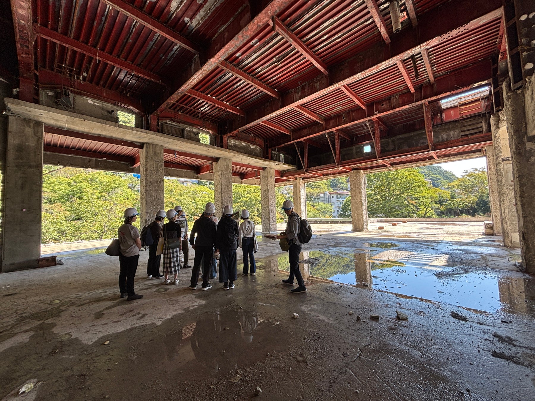 自然とまちの間に擁壁のように築かれた廃墟ホテルは、最大7層あった躯体を棟に応じて1~5層まで減築することで、70年ぶりに山の風景や川音、SLの汽笛をまちに取り戻すことにつながったことなども伝えられ、利根川の渓流ぎりぎりに建つ立地や、増築を繰り返した結果生まれた複雑な内部空間、様々な自然風景を切り取る力強い躯体といった、再生建築の現場を味わっていただき、参加者からは感動の声が溢れていました。