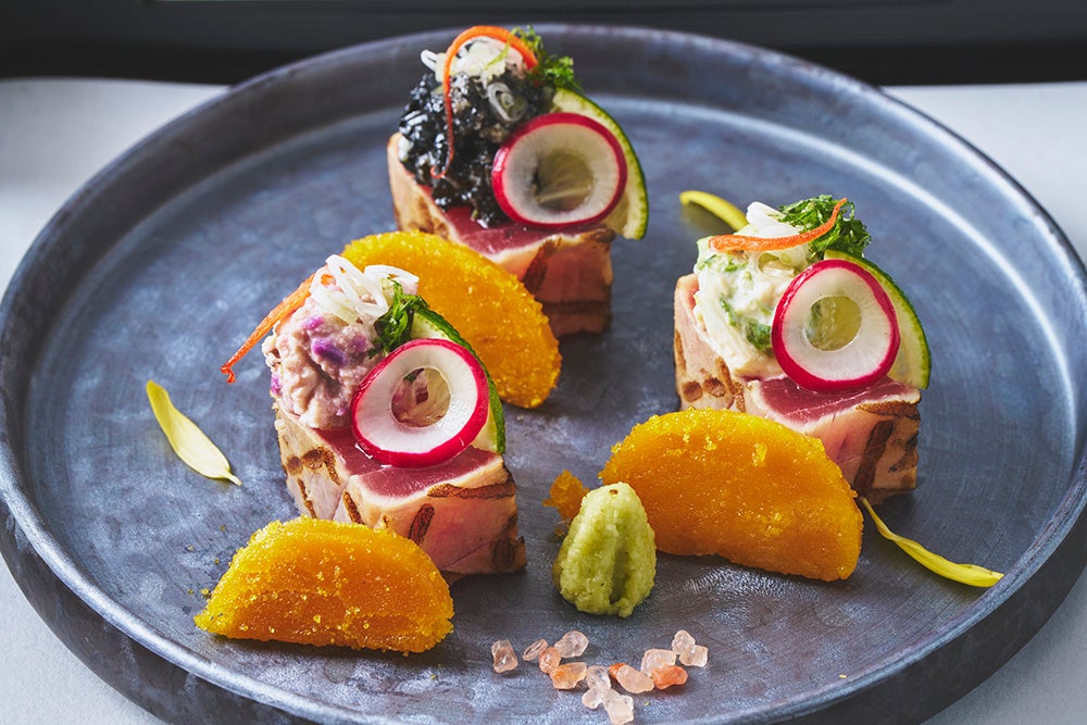沖縄在来種の島らっきょうは香りと辛味が強く、本土のものより小ぶりなのが特徴です。島らっきょうのタルタルソース3種を、近海炙りまぐろと唐墨に合わせました。
