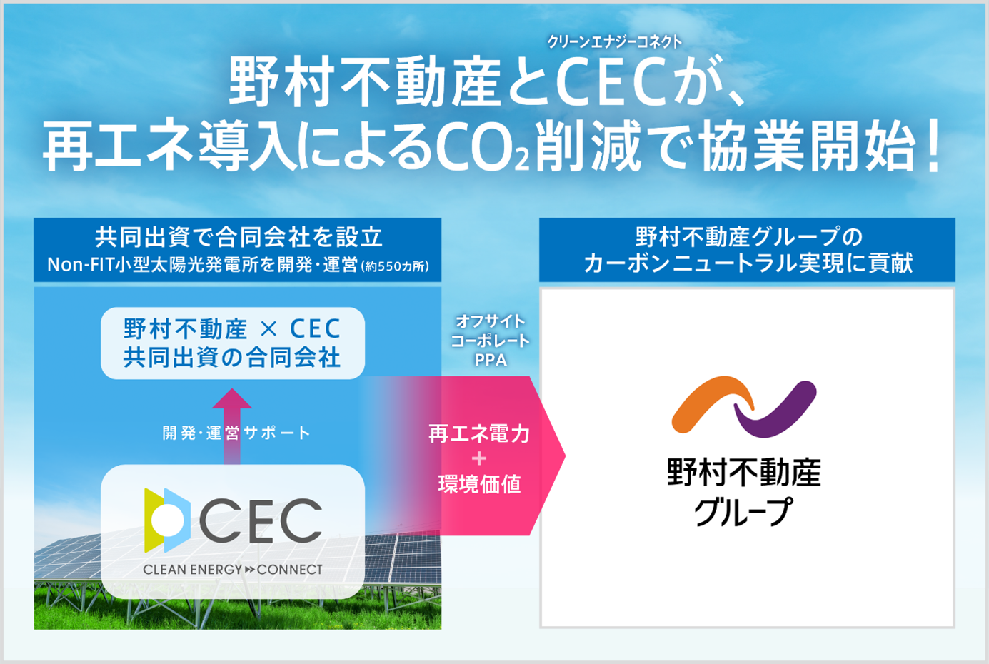野村不動産株式会社(本社:東京都港区/代表取締役社長:松尾大作、以下「野村不動産」)と株式会社クリーンエナジーコネクト(本社:東京都千代田区、代表取締役:内田鉄平、以下「クリーンエナジーコネクト」)は、再エネ導入によるCO2 削減で協業を開始します。