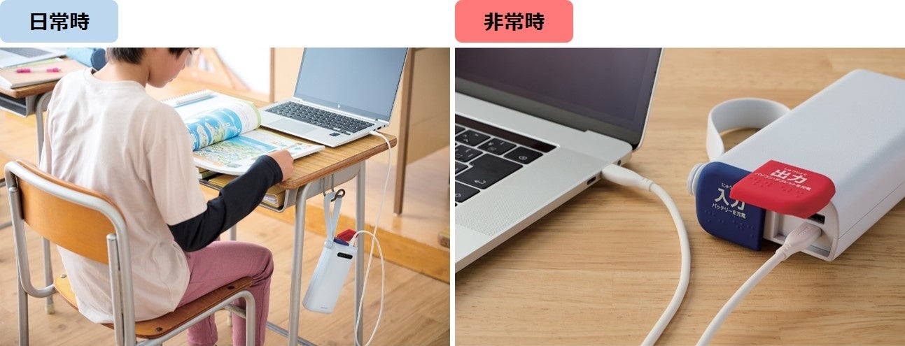 学校で使用するパソコンやタブレットの充電におすすめのモバイルバッテリーです。机の横のフックに吊って充電することができるため、学校の小さな机でもスペースを確保することができます。使用しない時は学校の保管庫などでバッテリー本体を充電することで、災害などの非常時に学校に避難してきた被災者のスマートフォンを充電することもできます。