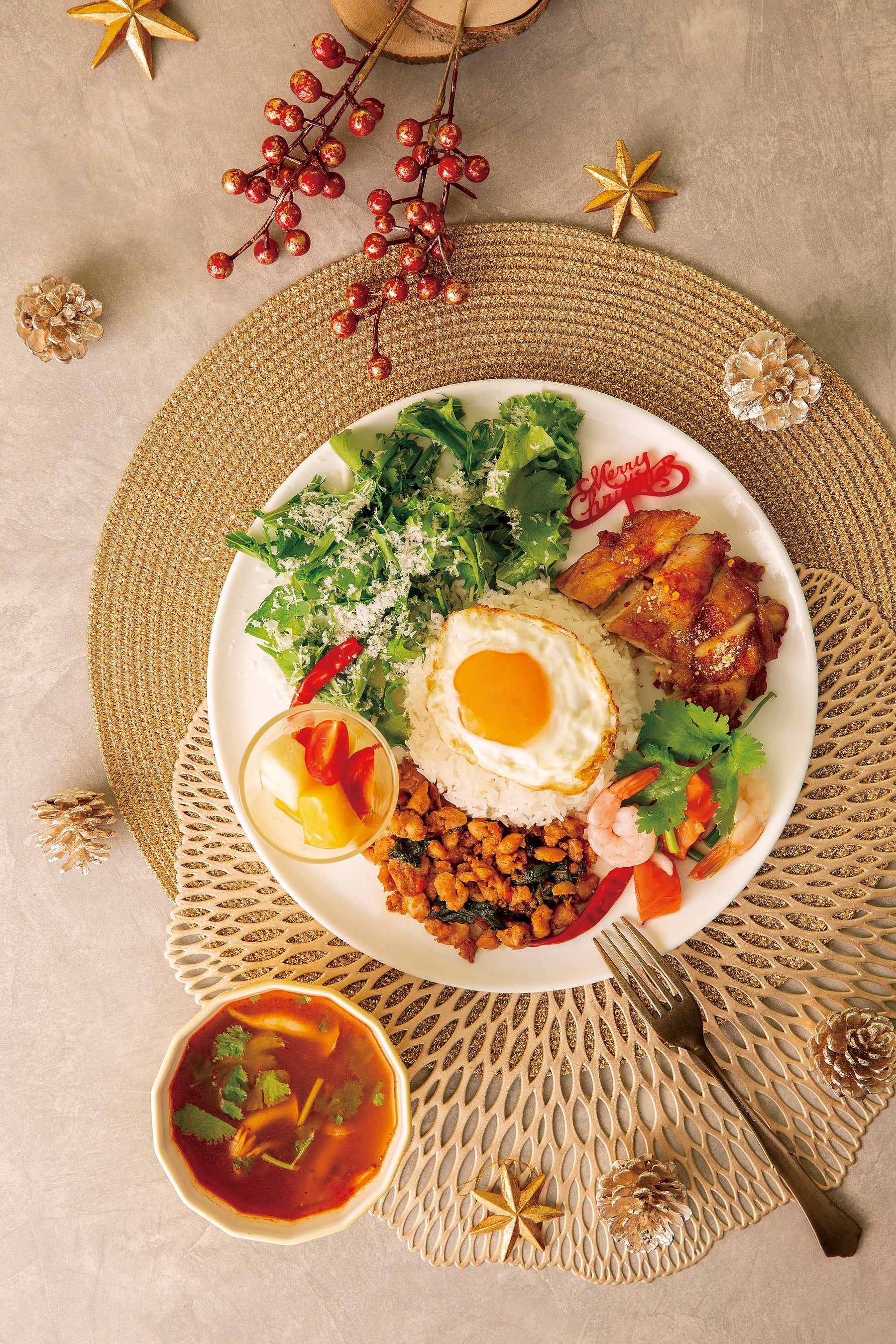 タイの調味料で味付けした鶏のBBQグリル“ガイヤーン”、日本でも最もポピュラーなタイ料理 鶏の“ガパオ”、海老とサーモンのスパイシーハーブ和え“ラープ”、グリーンサラダ、フルーツのソムタムソースがけをジャスミンライス&揚げ目玉焼き“カイダオ”の周りに盛り付けて、クリスマスリースに見立てたワンプレートメニュー。トムヤムスープ付です。