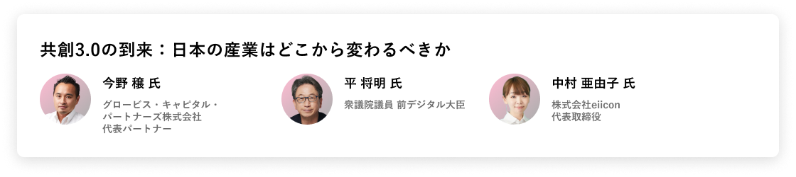 業界の最前線を走るリーダーたちが登壇。経営戦略、テクノロジー、グローバル展開など、多角的な視点から「共創3.0」時代の新たなビジネスモデルを議論する多彩なセッションを展開します。