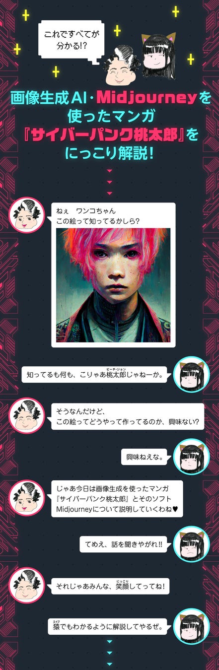画像生成AIを使って描かれた初の本格SFコミック、加筆修正に加え、AIを使ったマンガの作り方を丁寧に解説した書き下ろしも収録。超未来童話『サイバーパンク桃太郎』フルカラーコミックでお届け!