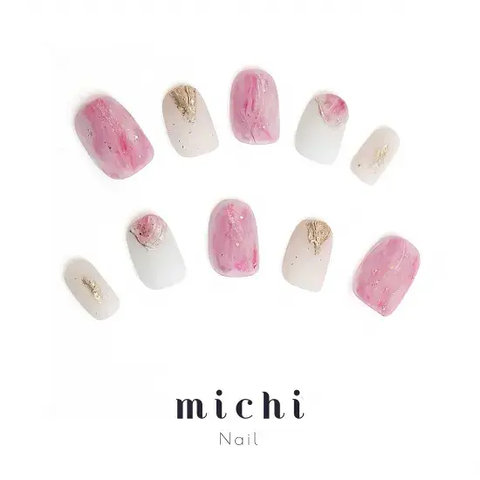 透明感のあるピンクのマーブル模様と、大人っぽいミルキーホワイトのニュアンスを組み合わせたネイルチップです。ゴールドラメとミラーをアクセントに使用し、落ち着いた可愛さと上品さを兼ね備えたデザインで、さまざまなシーンで活躍します。
