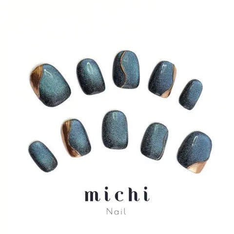 ブルーに輝くクールなマグネットネイルに、ゴールドのワンポイントを加えたデザインです。ブルー系のファッションや着物とも相性が良く、スタイリッシュで印象的な指先を演出します。