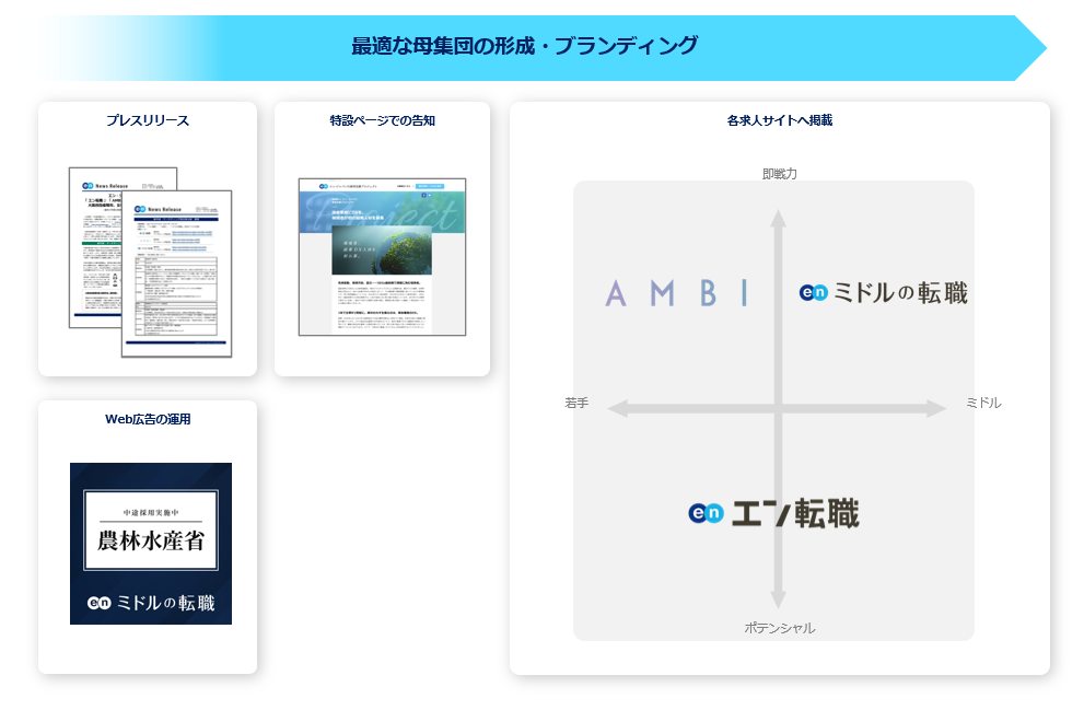 プレスリリースや特設ページ、Web広告での告知に加え、各求人サイトでの集客支援を実施。『エン転職』『AMBI』『ミドルの転職』とターゲットの異なる求人サイトを活用することで、ターゲットへ網羅的に求人を届けました。