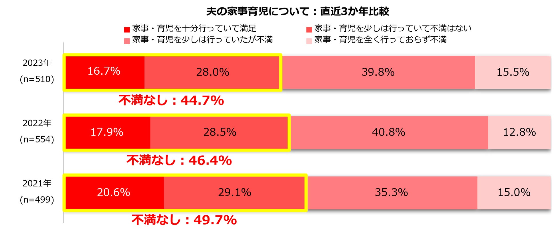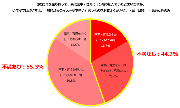 【夫の家事・育児2023】夫の家事に「満足」16.7%、「不満」55.3%