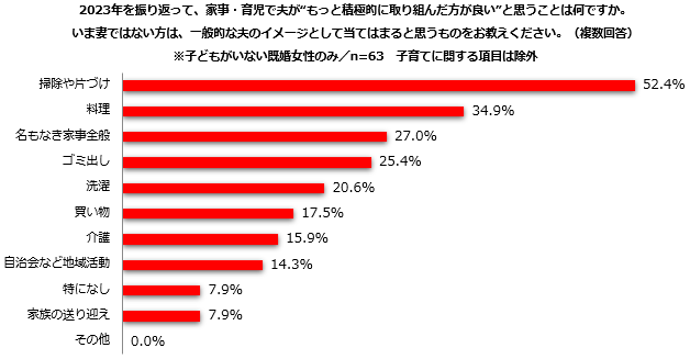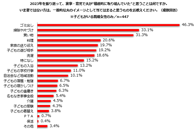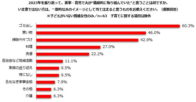 就労志向の既婚女性に「2023年を振り返って、夫は家事・育児に十分取り組んでいたと思いますか」と尋ねたところ、「不満」と回答した人が55.3%と過半数でした。それ以外の「不満なし」と回答した人の比率は44.7%で、直近3か年比較で最も低くなっています。男性の育休取得率が年々上昇傾向にある一方で、家事・育児に対する妻側の満足状況は逆行してしまっているようです。また、「2023年を振り返って、家事・育児で夫が“積極的に取り組んでいた”と思うことは何ですか」との質問には、お子さんがいない人といる人のいずれにおいても、「ゴミ出し」と回答した人の比率が最も多くなりました。