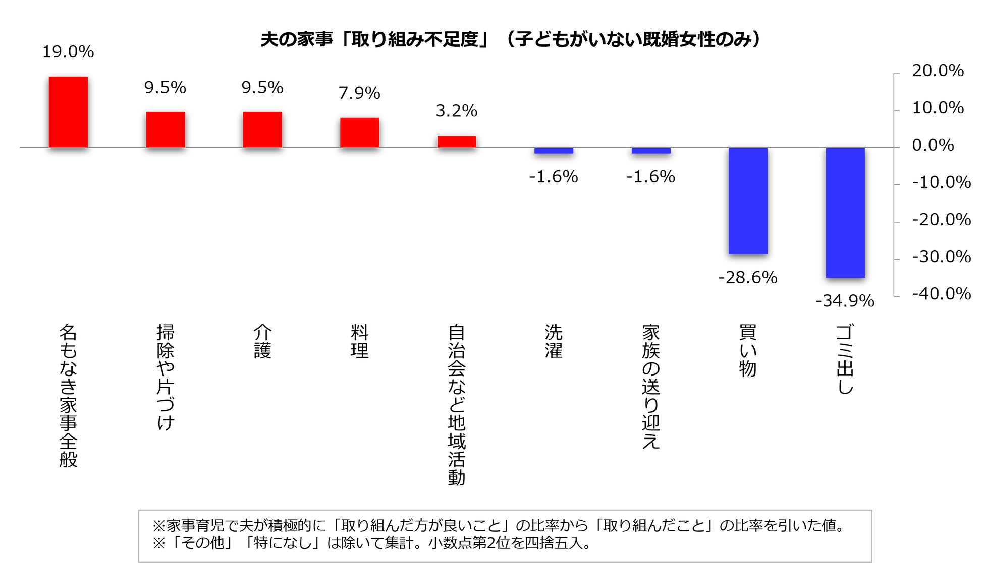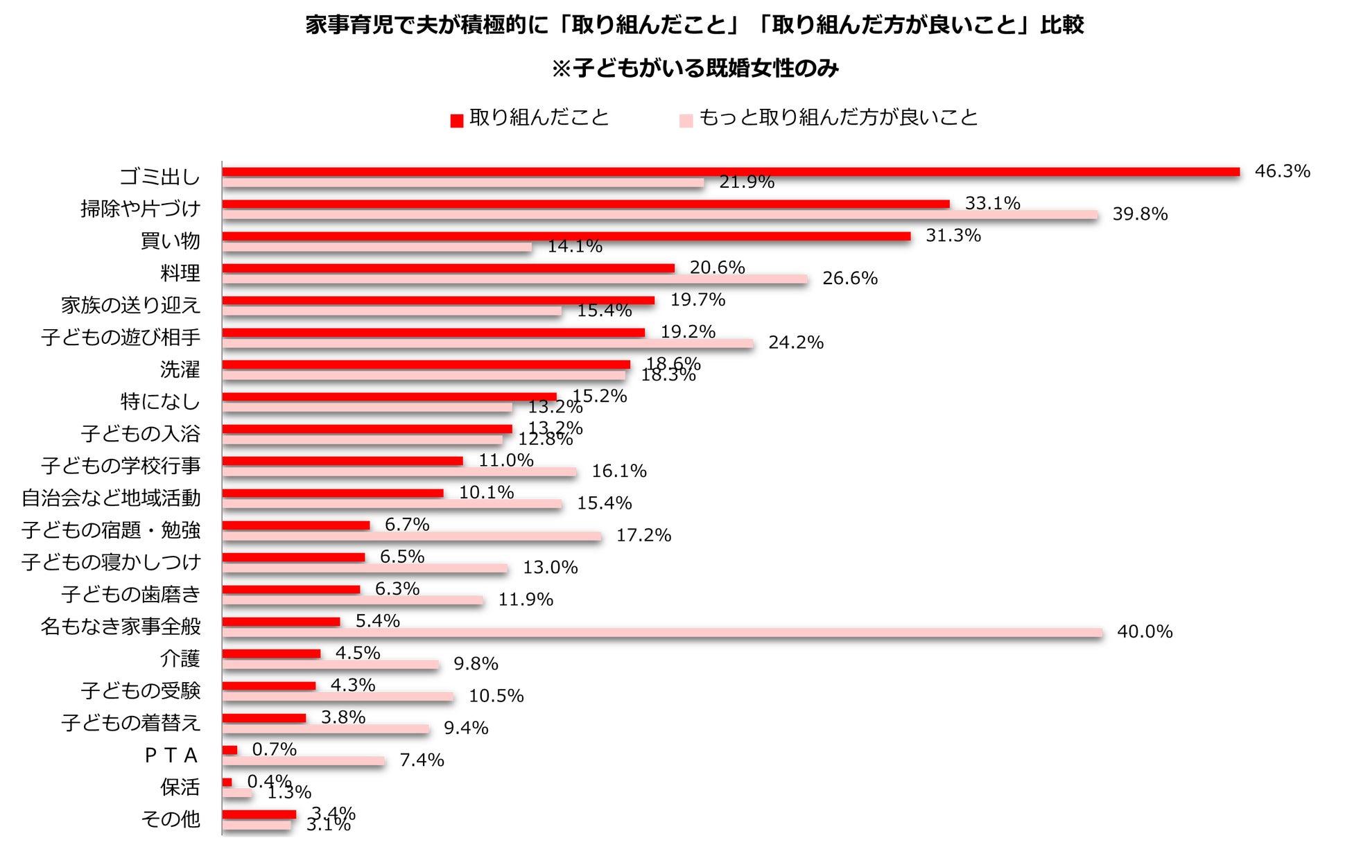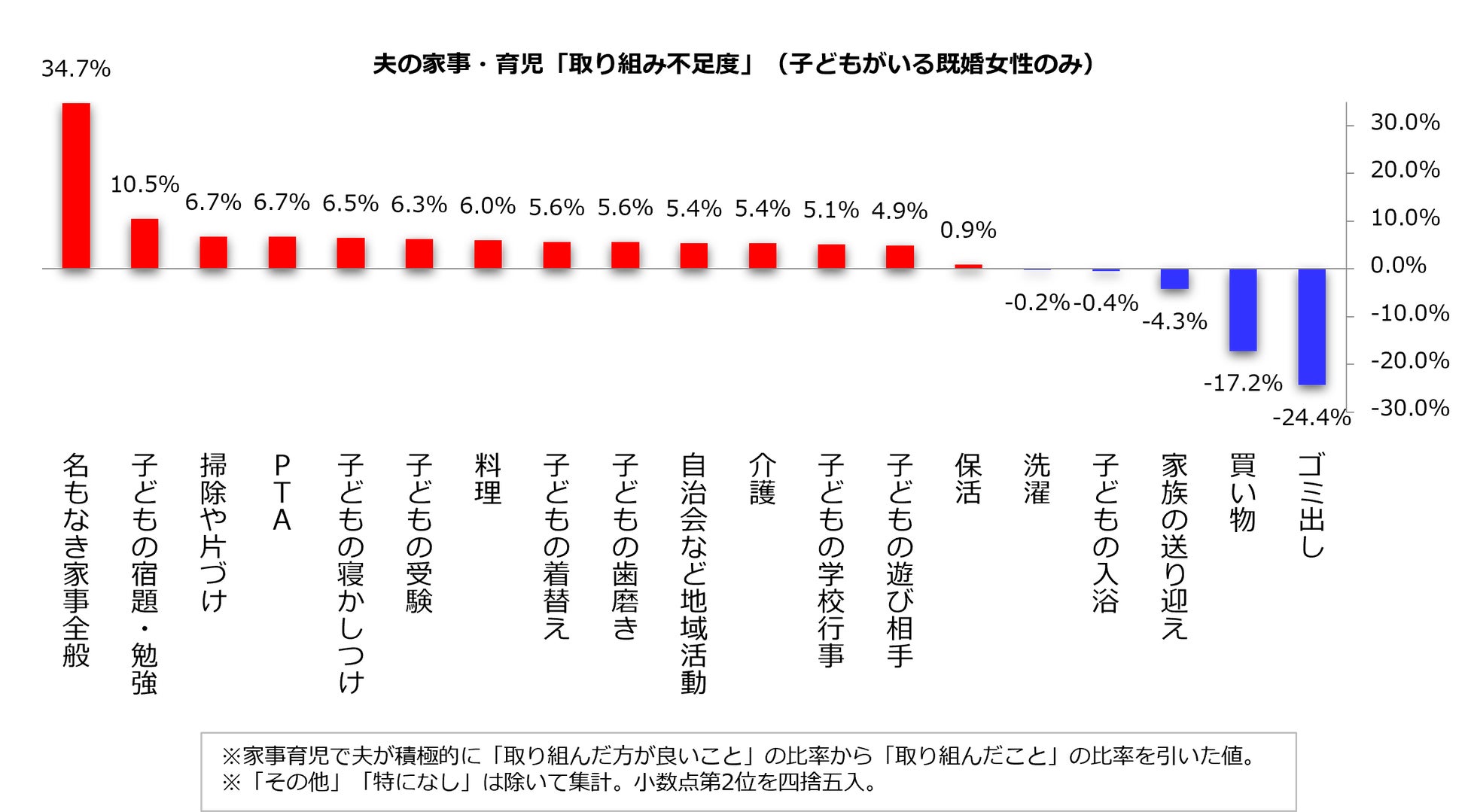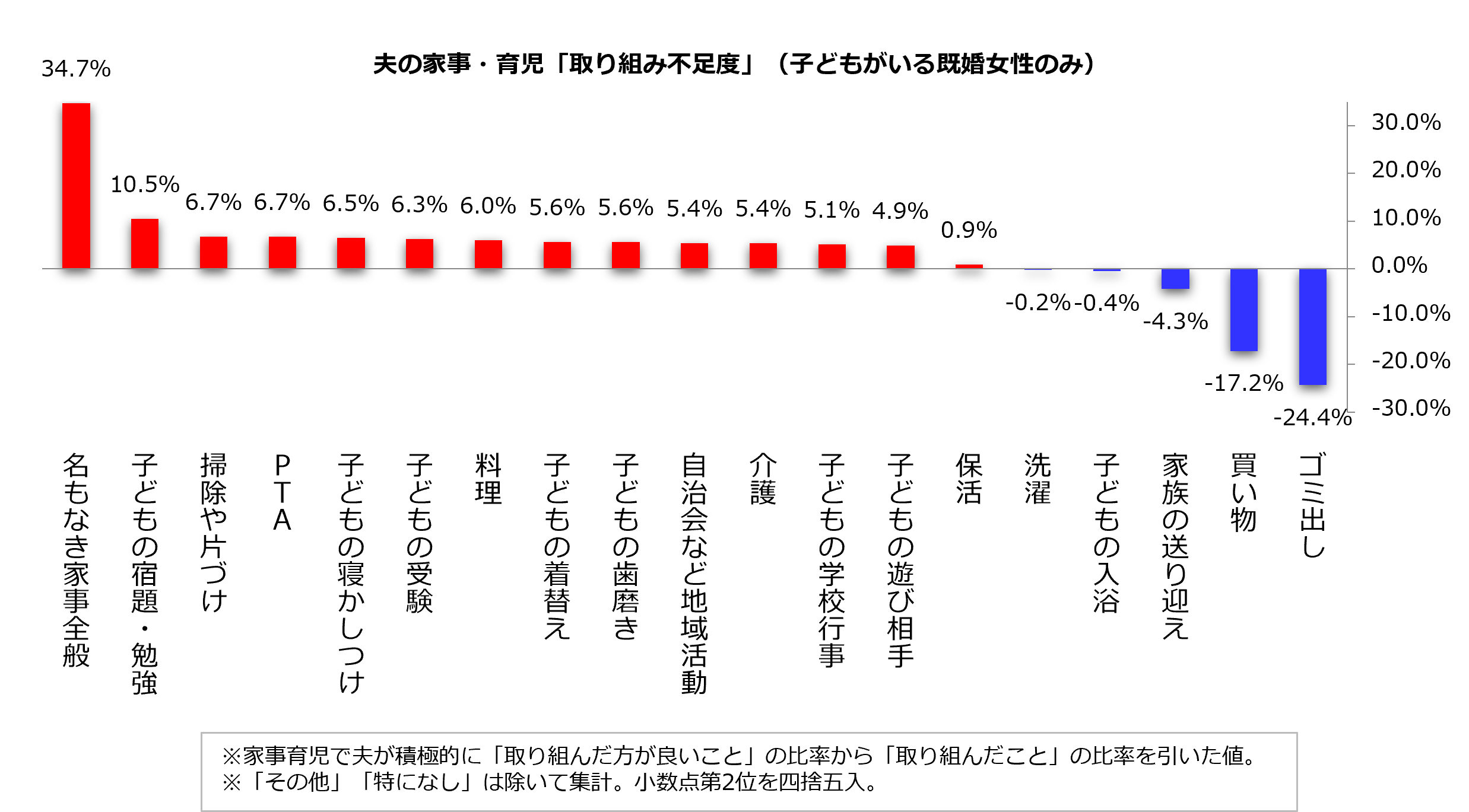 1.夫の家事・育児に「満足」16.7%、「不満」55.3% 2.「現実とイメージ」、「直近3か年」、「子どもの数別」比較 3.取り組んでいた家事は、子どもいる・いない共に「ゴミ出し」が最多 4.子どもいる夫が取り組んだ方がいい家事は、「名もなき家事全般」が最多 5.夫の家事・育児「取り組み不足度」 6.フリーコメントより |