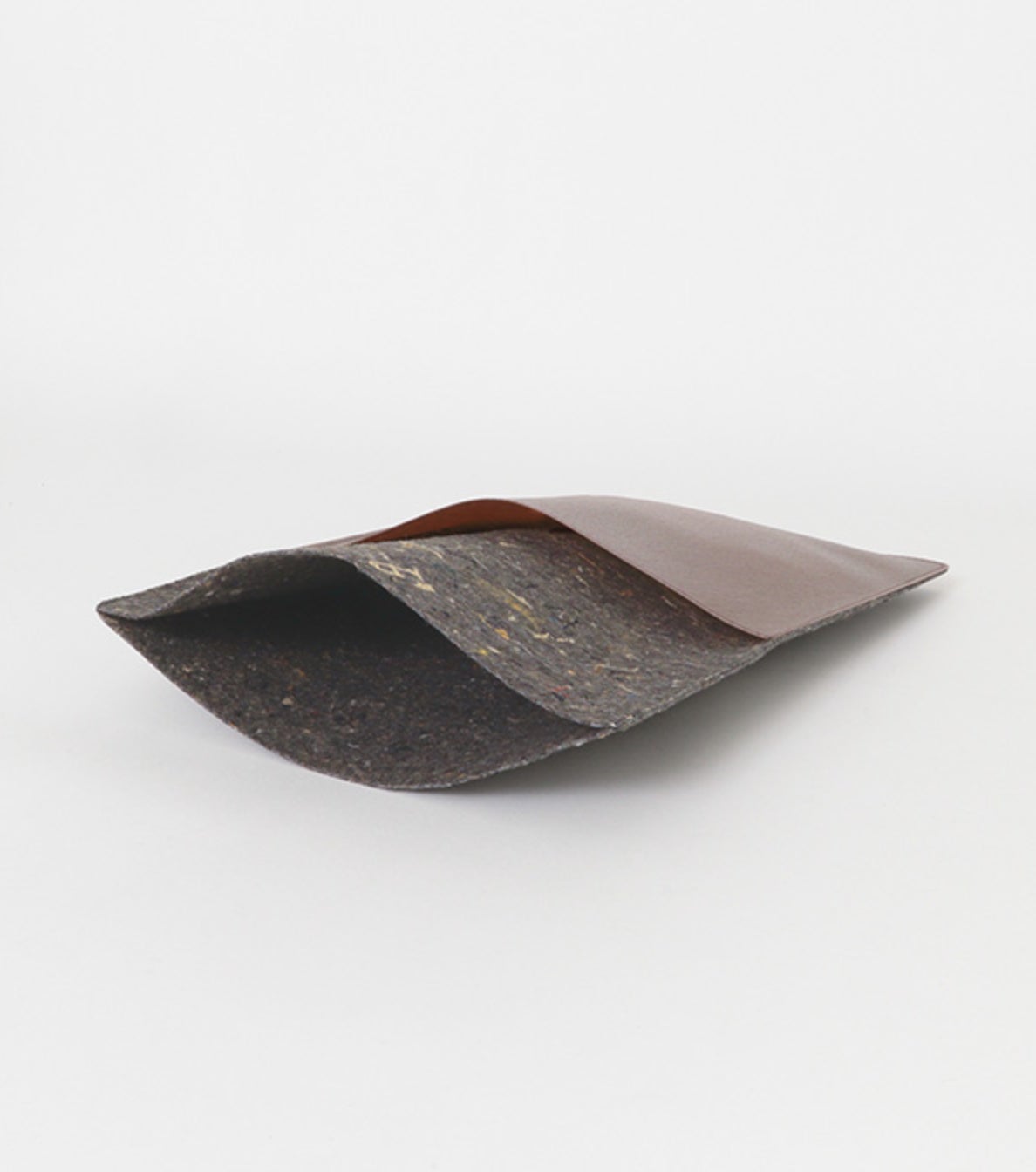 オリジナルフェルトと、同じく廃棄衣料をアップサイクルした、レザーライクな印象をもつ既存のcommpost生地との組み合わせがスタイリッシュな雰囲気に仕上げました。
