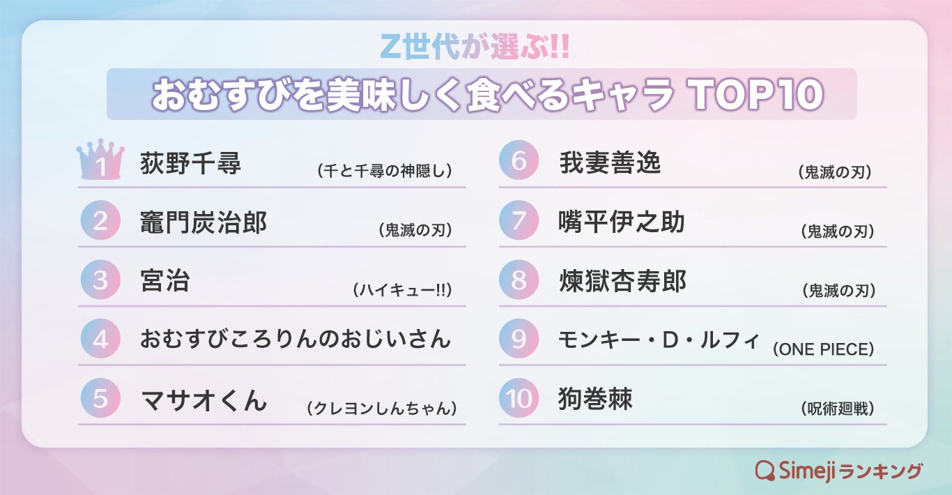 【Simejiランキング】Z世代が選ぶ!!「おむすびを美味しく食べるキャラTOP10」