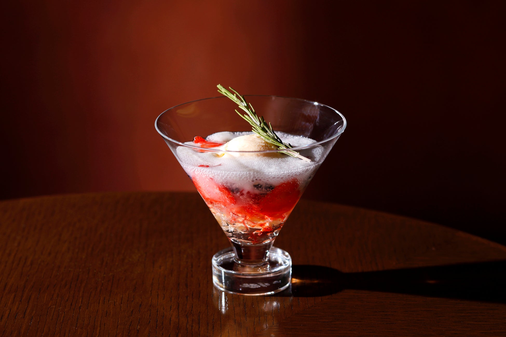 ロマンティックなローズのゼリーに、フレッシュなベリーとアイスクリーム。お席でシャンパンを注ぐ、大人のパフェのようなカクテルです。